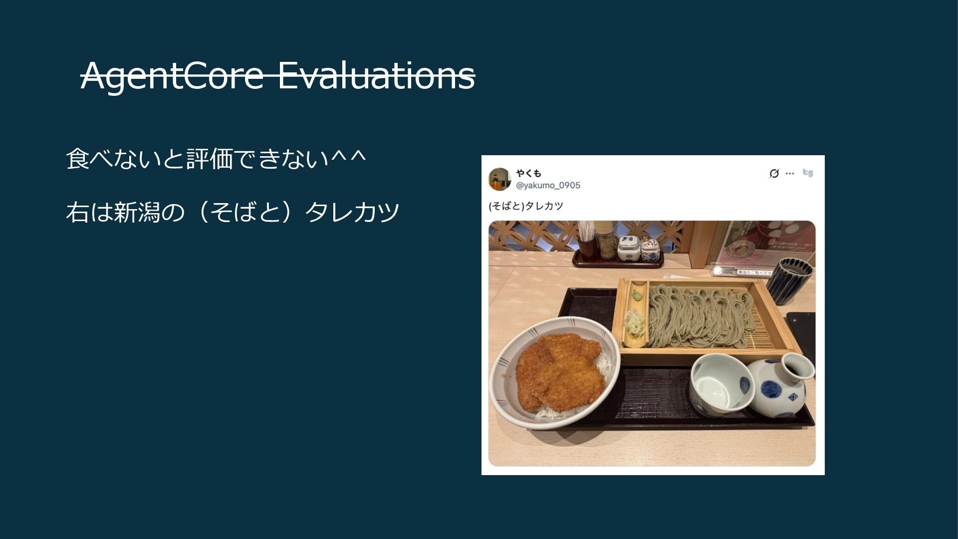 AgentCore Evaluations 食べないと評価できない^^ 右は新潟の(そばと)タレカツ