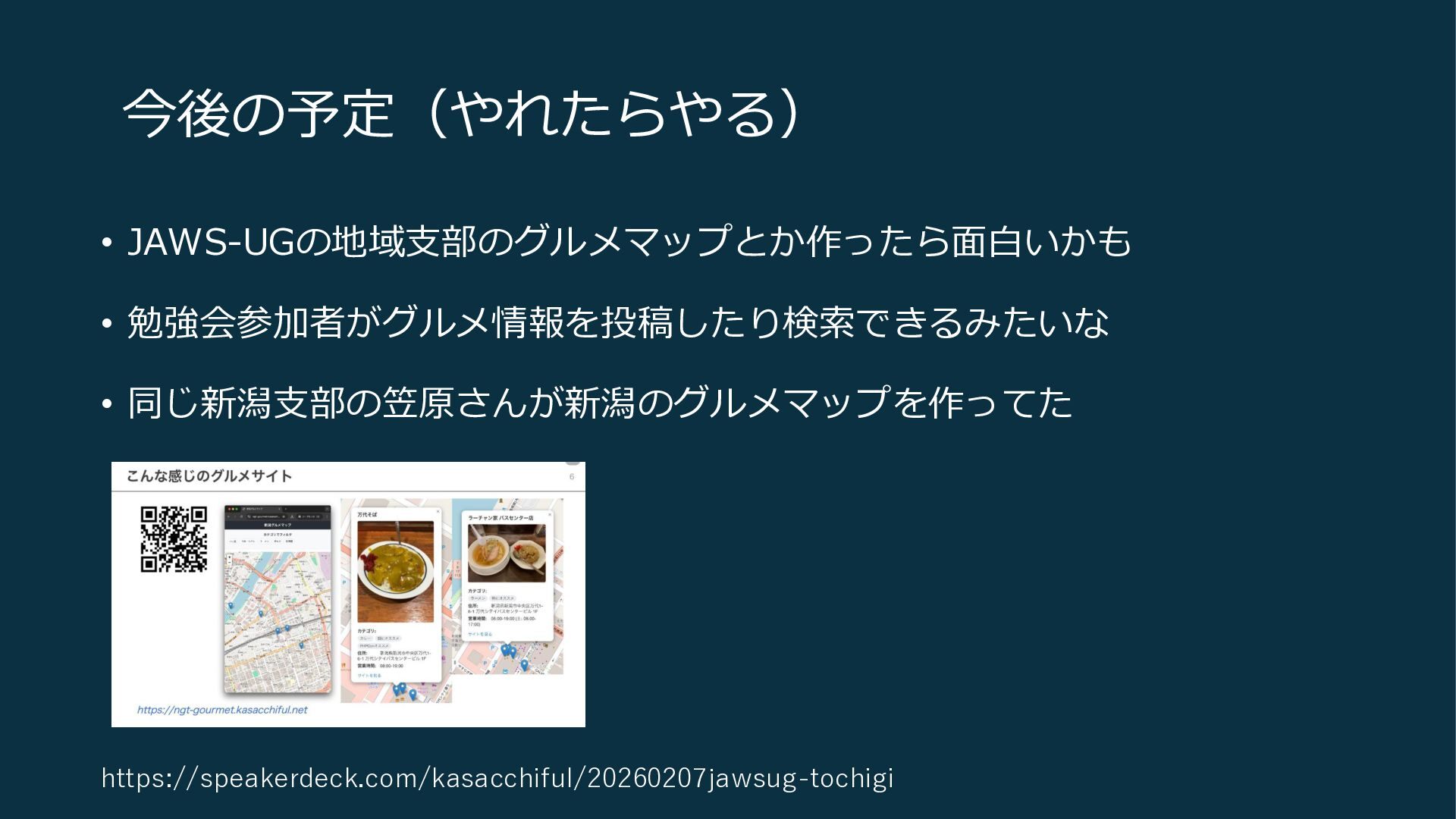 今後の予定(やれたらやる) • JAWS-UGの地域支部のグルメマップとか作ったら面白いかも • 勉強会参加者がグルメ情報を投稿したり検索できるみたいな • 同じ新潟支部の笠原さんが新潟のグルメマップを作ってた https://speakerdeck.com/kasacchiful/20260207jawsug-tochigi