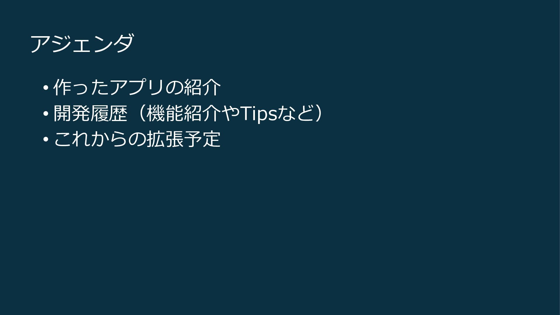 アジェンダ • 作ったアプリの紹介 • 開発履歴(機能紹介やTipsなど) • これからの拡張予定