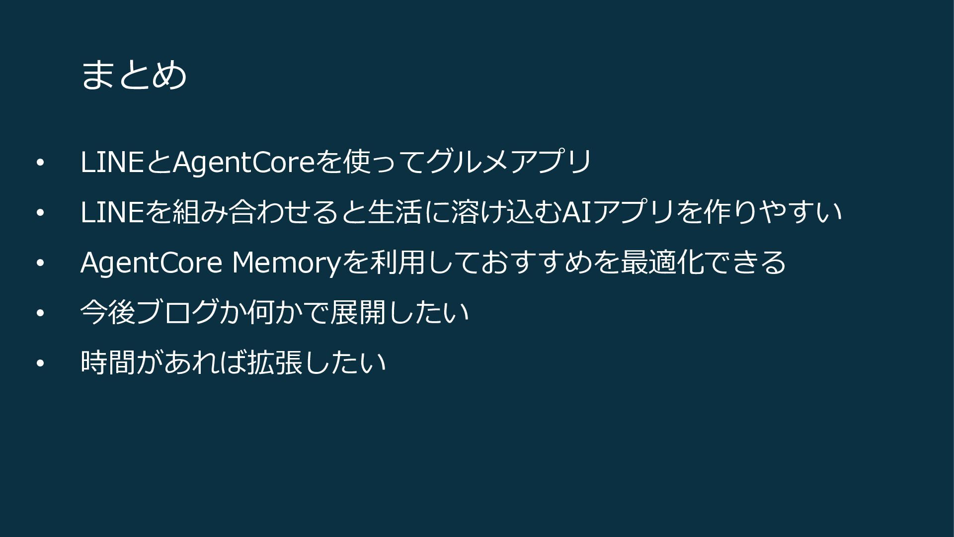 まとめ • LINEとAgentCoreを使ってグルメアプリ • LINEを組み合わせると生活に溶け込むAIアプリを作りやすい • AgentCore Memoryを利用しておすすめを最適化できる • 今後ブログか何かで展開したい