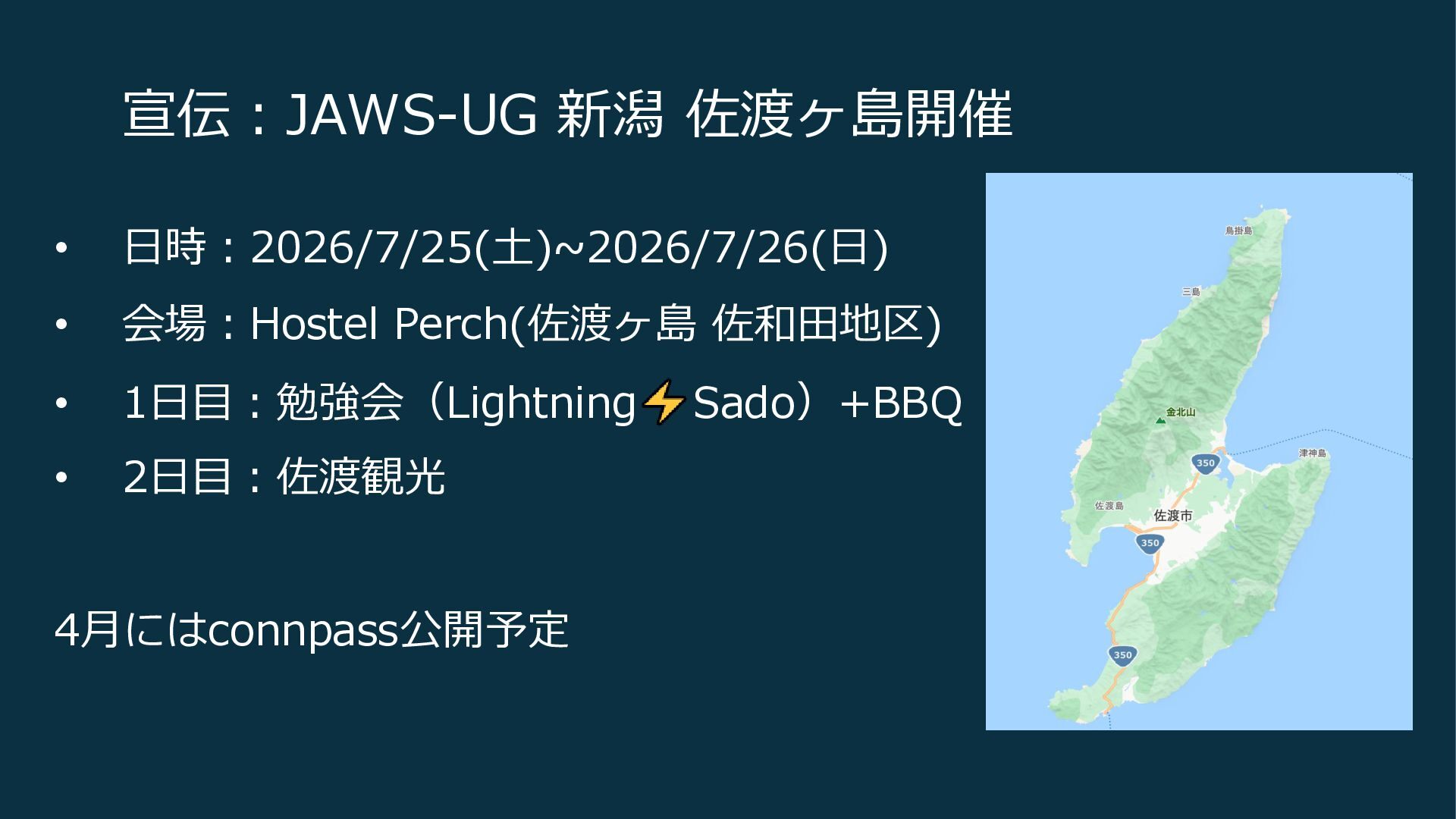 宣伝:JAWS-UG 新潟 佐渡ヶ島開催 • 日時:2026/7/25(土)~2026/7/26(日) • 会場:Hostel Perch(佐渡ヶ島 佐和田地区) •