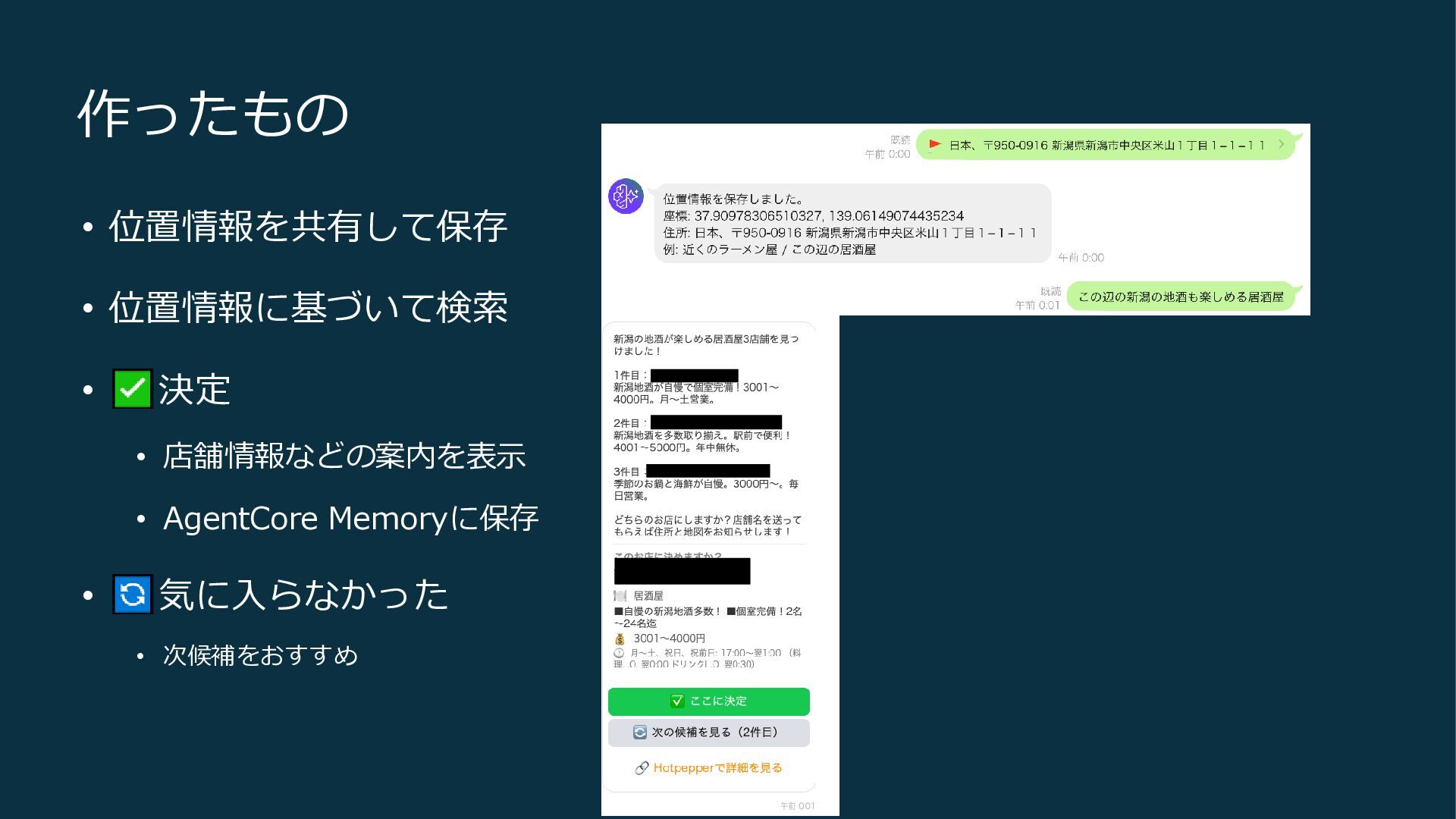 きっかけ • 酔っ払った後の2次会、3次会はお店探しがめんどくさい • 位置情報を共有、飲食店をAIが勝手に探してくれたら便利じゃ ね? • AgentCoreとLINEを使って作ってみるか^^