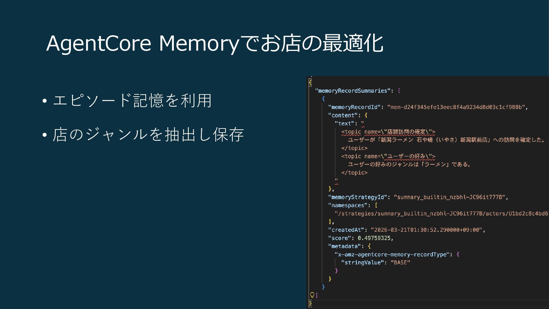 AgentCore Memoryでお店の最適化 • エピソード記憶を利用 • 店のジャンルを抽出し保存