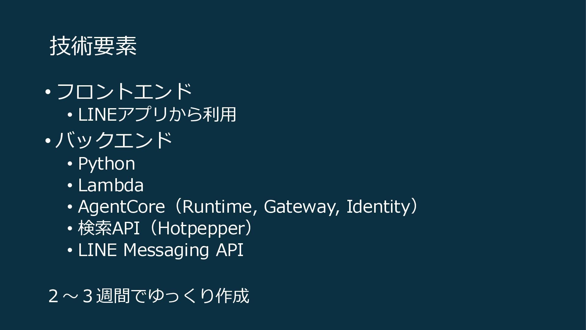 Lambda • AgentCore(Runtime, Gateway, Identity) • 検索API(Hotpepper) • LINE Messaging API 2〜3週間でゆっくり作成