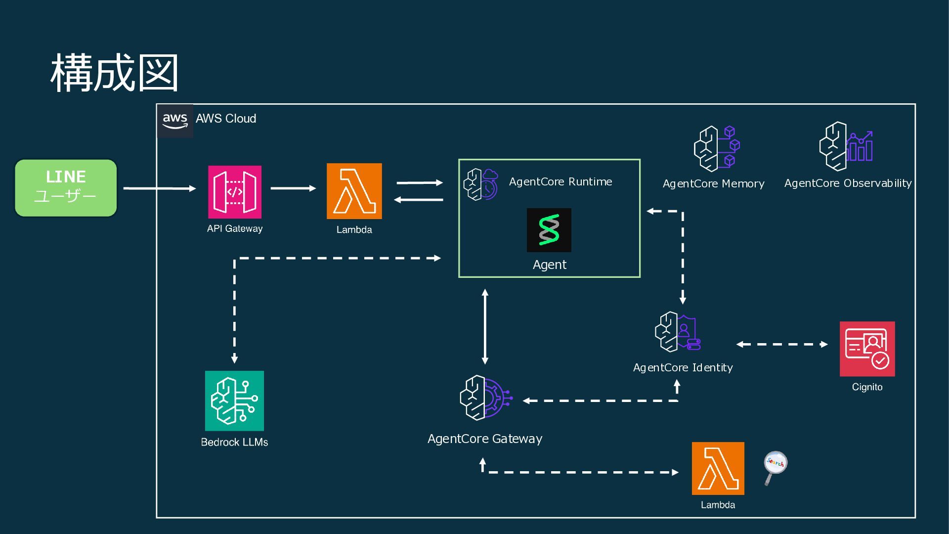 構成図 LINE ユーザー AgentCore Runtime AgentCore Gateway AgentCore Identity AgentCore