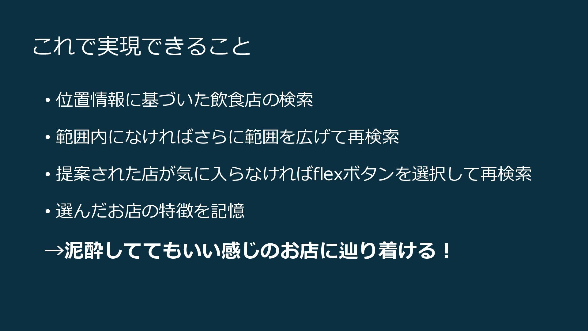これで実現できること • 位置情報に基づいた飲食店の検索 • 範囲内になければさらに範囲を広げて再検索 • 提案された店が気に入らなければflexボタンを選択して再検索 • 選んだお店の特徴を記憶 →泥酔しててもいい感じのお店に辿り着ける!