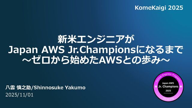 新米エンジニアが Japan AWS Jr.Championsになるまで 〜ゼロから始めたAWSとの歩み〜 八雲 慎之助/Shinnosuke Yakumo 2025/11/01 KomeKaigi