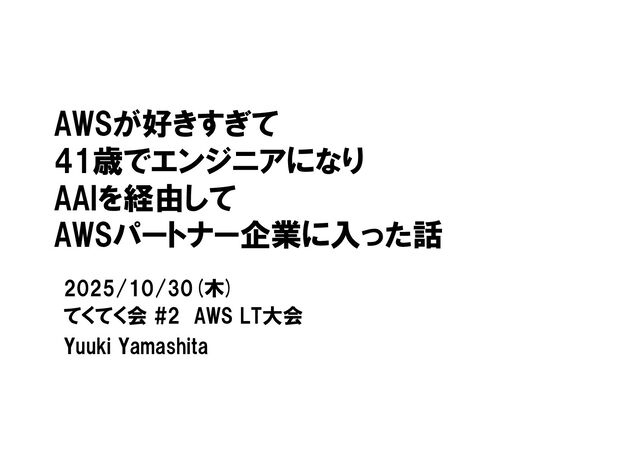 AWSが好きすぎて 41歳でエンジニアになり AAIを経由して AWSパートナー企業に入った話 2025/10/30(木) てくてく会 #2 AWS LT大会 Yuuki