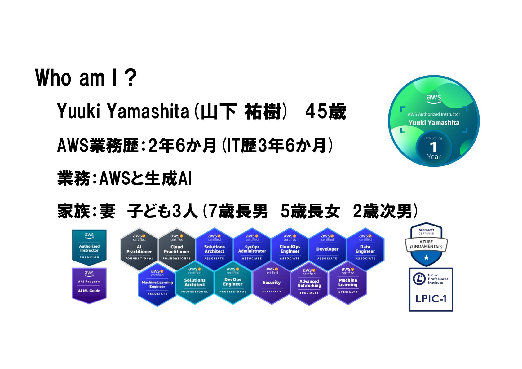 Who am I ? Yuuki Yamashita(山下 祐樹) 45歳 AWS業務歴:2年6か月(IT歴3年6か月) 業務:AWSと生成AI
