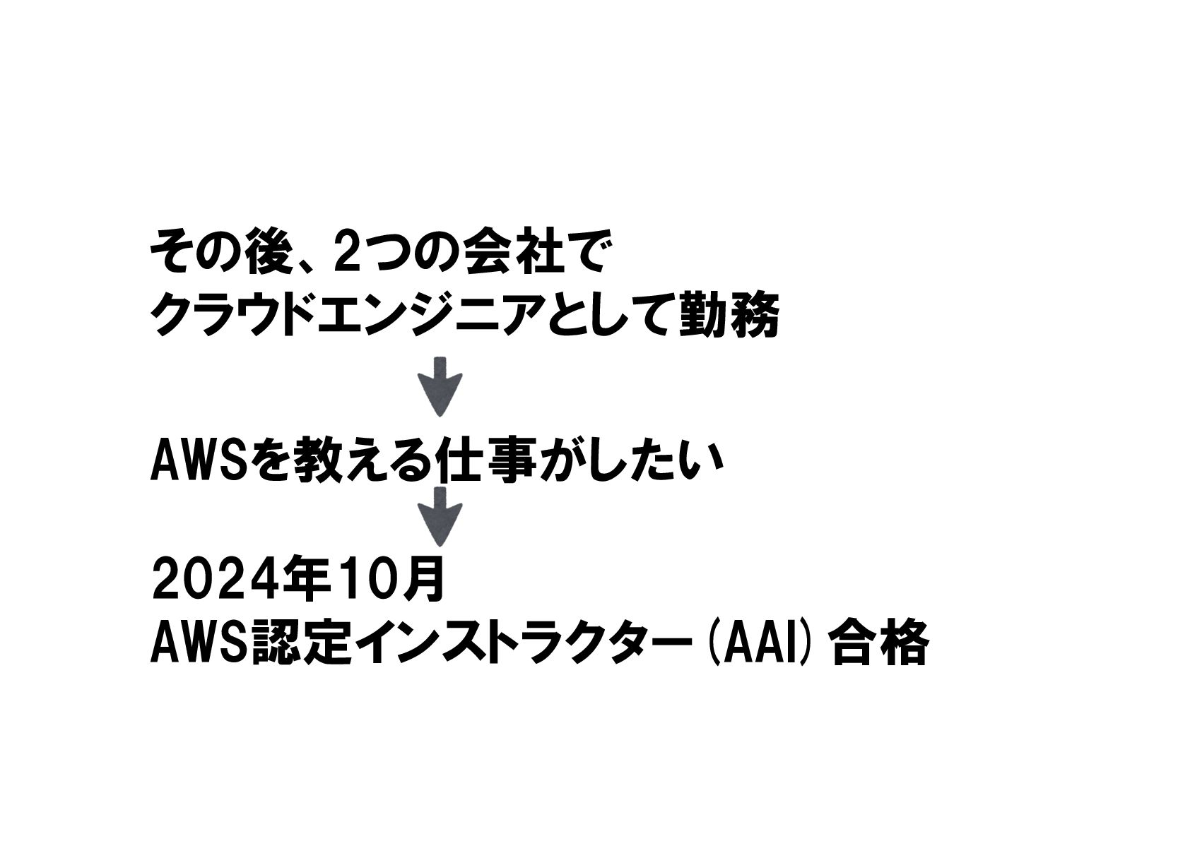 その後、2つの会社で クラウドエンジニアとして勤務 AWSを教える仕事がしたい 2024年10月 AWS認定インストラクター(AAI)合格