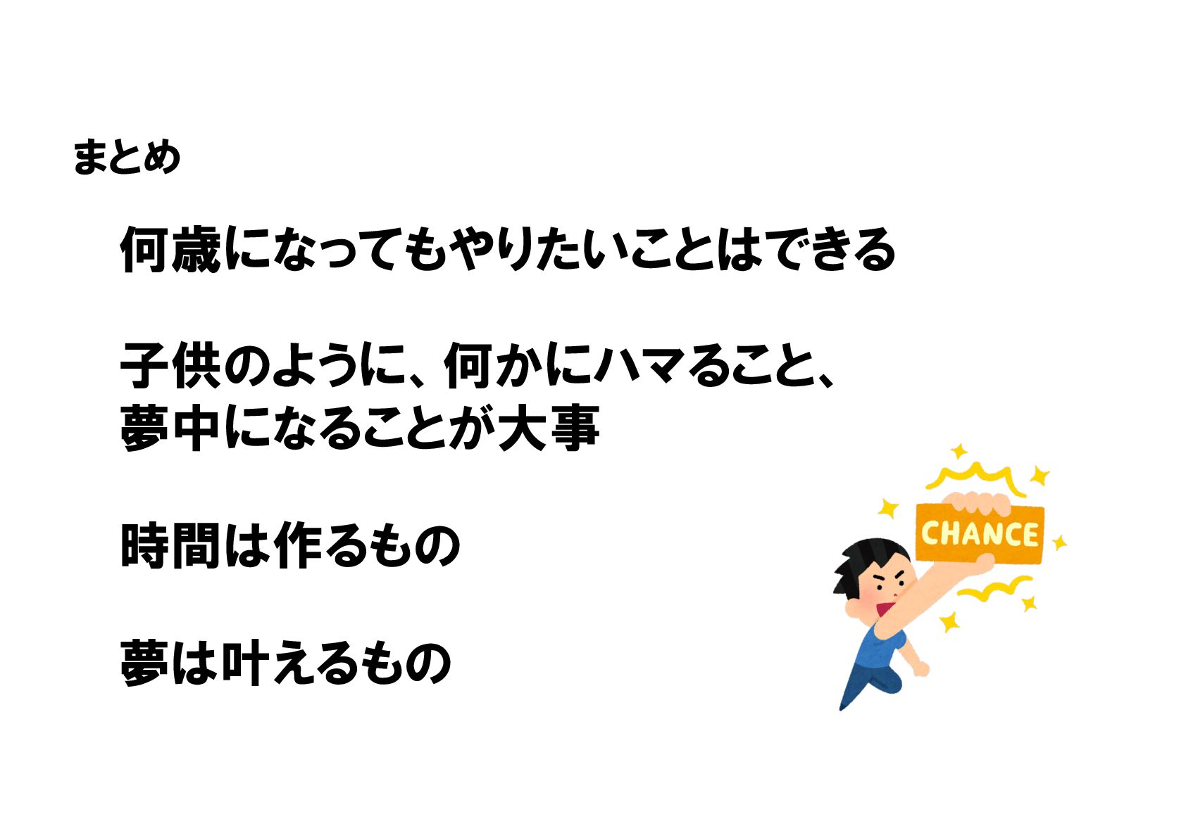 "84͕͖͗ͯ͢ ࡀͰΤϯδχΞʹͳΓ ""*Λܦ༝ͯ͠ "84ύʔτφʔاۀʹೖͬͨ 何歳になってもやりたいことはできる 子供のように、何かにハマること、 夢中になることが大事 時間は作るもの 夢は叶えるもの まとめ