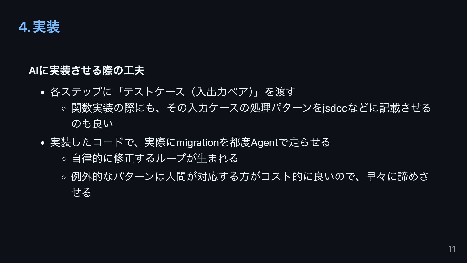 AIに実装させる際の工夫 各ステップに「テストケース(入出力ペア) 」を渡す 関数実装の際にも、その入力ケースの処理パターンをjsdocなどに記載させる のも良い 実装したコードで、実際にmigrationを都度Agentで走らせる 自律的に修正するループが生まれる 例外的なパターンは人間が対応する方がコスト的に良いので、早々に諦めさ せる 4.