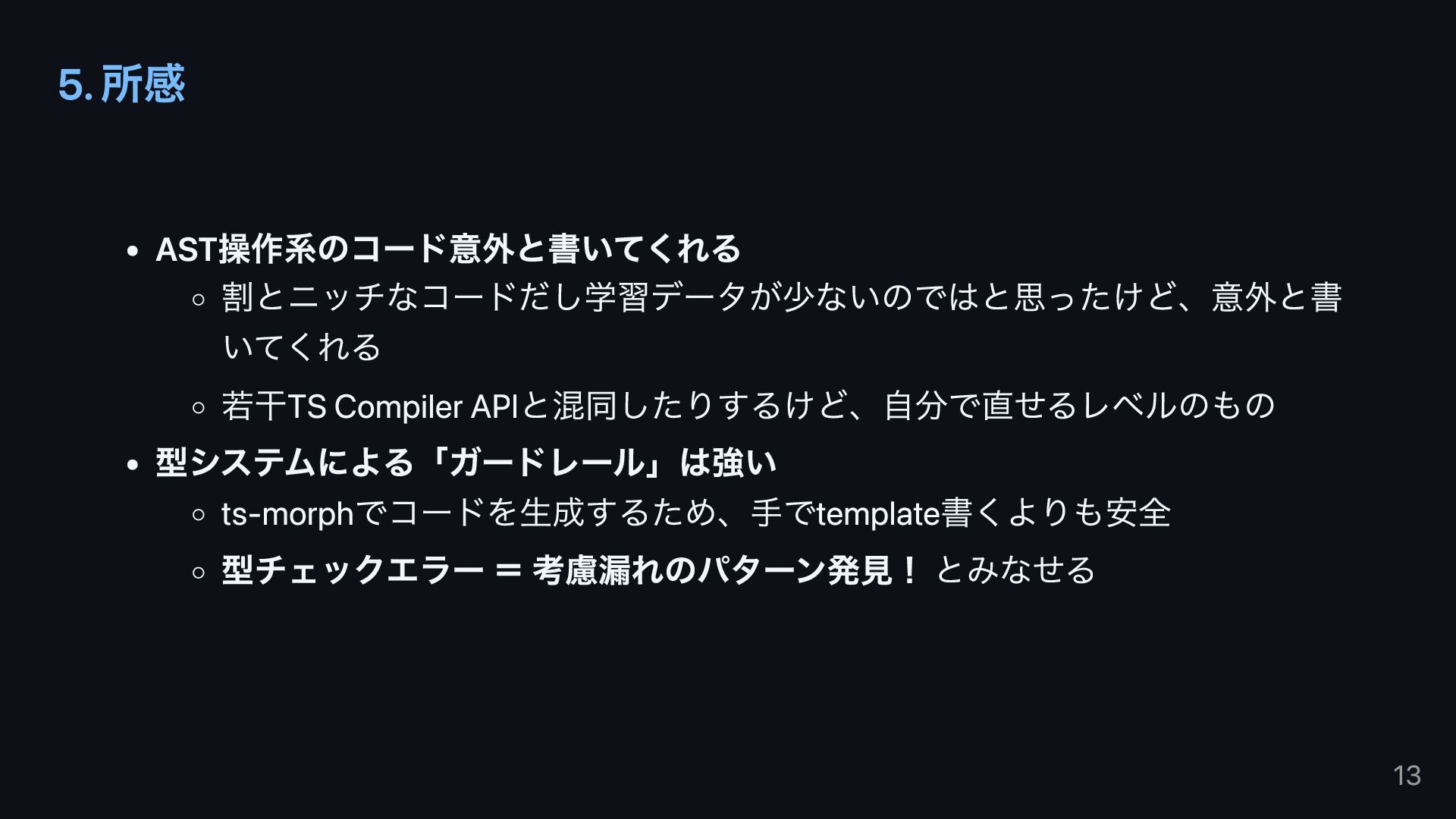 AST操作系のコード意外と書いてくれる 割とニッチなコードだし学習データが少ないのではと思ったけど、意外と書 いてくれる 若干TS Compiler APIと混同したりするけど、自分で直せるレベルのもの 型システムによる「ガードレール」は強い ts-morphでコードを生成するため、手でtemplate書くよりも安全 型チェックエラー =
