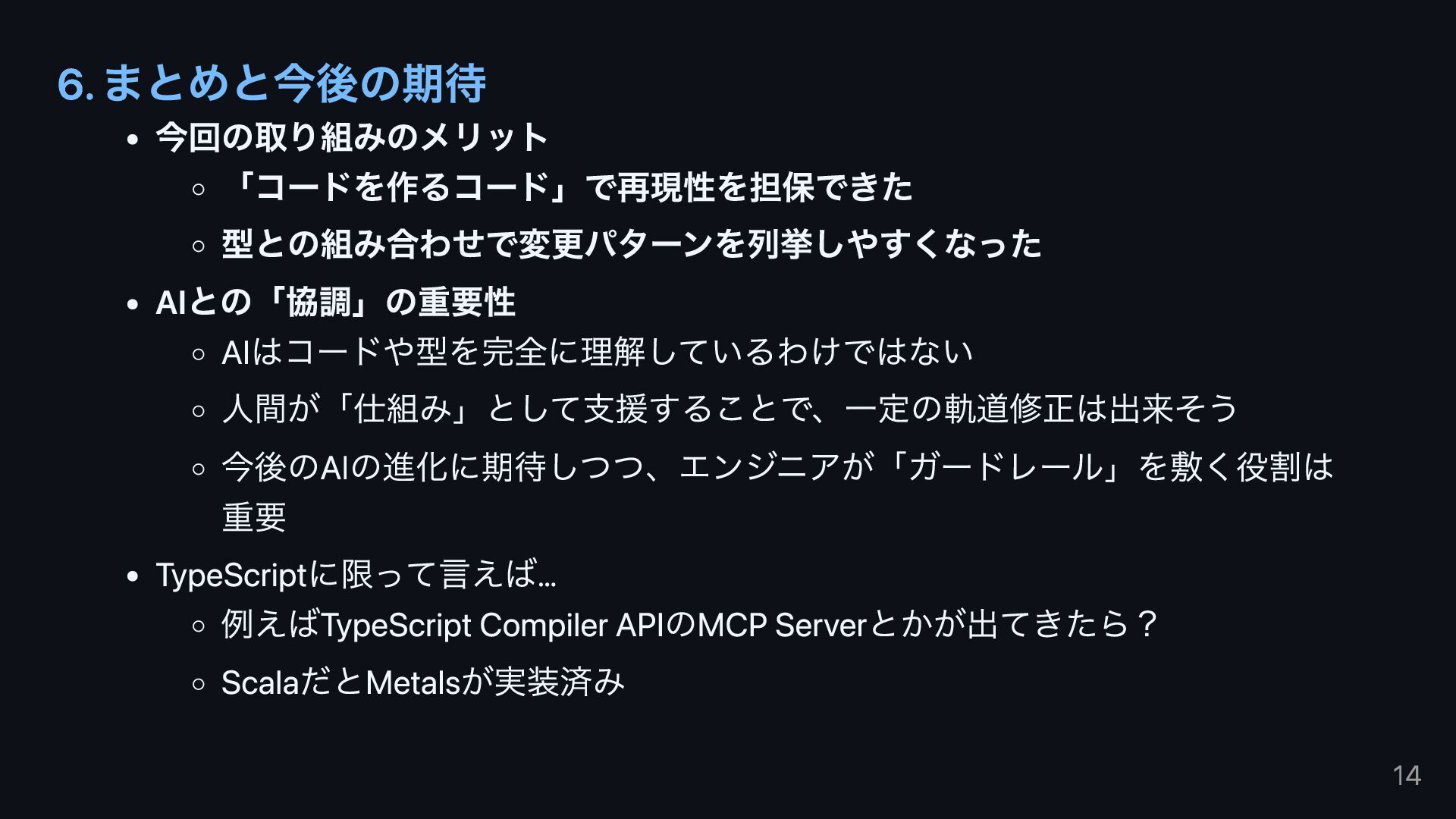 今回の取り組みのメリット 「コードを作るコード」で再現性を担保できた 型との組み合わせで変更パターンを列挙しやすくなった AIとの「協調」の重要性 AIはコードや型を完全に理解しているわけではない 人間が「仕組み」として支援することで、一定の軌道修正は出来そう 今後のAIの進化に期待しつつ、エンジニアが「ガードレール」を敷く役割は 重要 TypeScriptに限って言えば… 例えばTypeScript