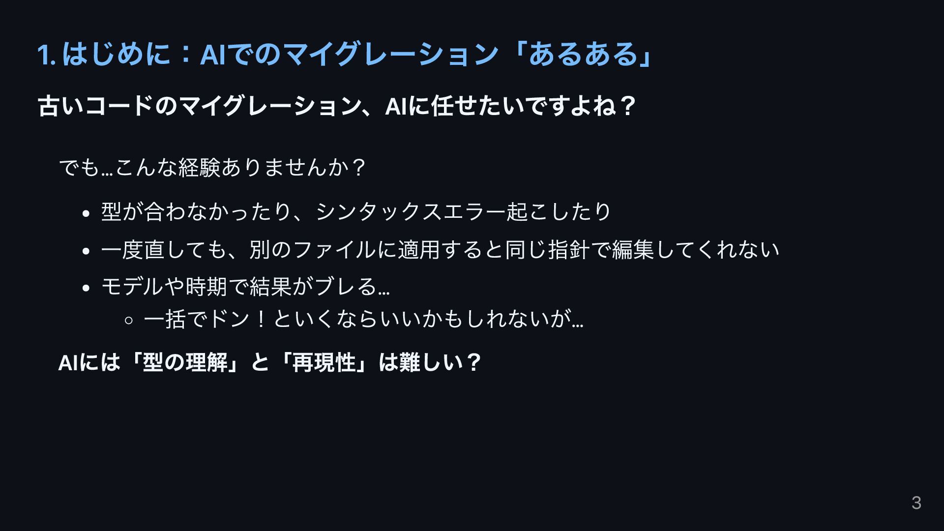 でも…こんな経験ありませんか? 型が合わなかったり、シンタックスエラー起こしたり 一度直しても、別のファイルに適用すると同じ指針で編集してくれない モデルや時期で結果がブレる… 一括でドン!といくならいいかもしれないが… AIには「型の理解」と「再現性」は難しい? 1. はじめに:AIでのマイグレーション「あるある」 古いコードのマイグレーション、AIに任せたいですよね? 3
