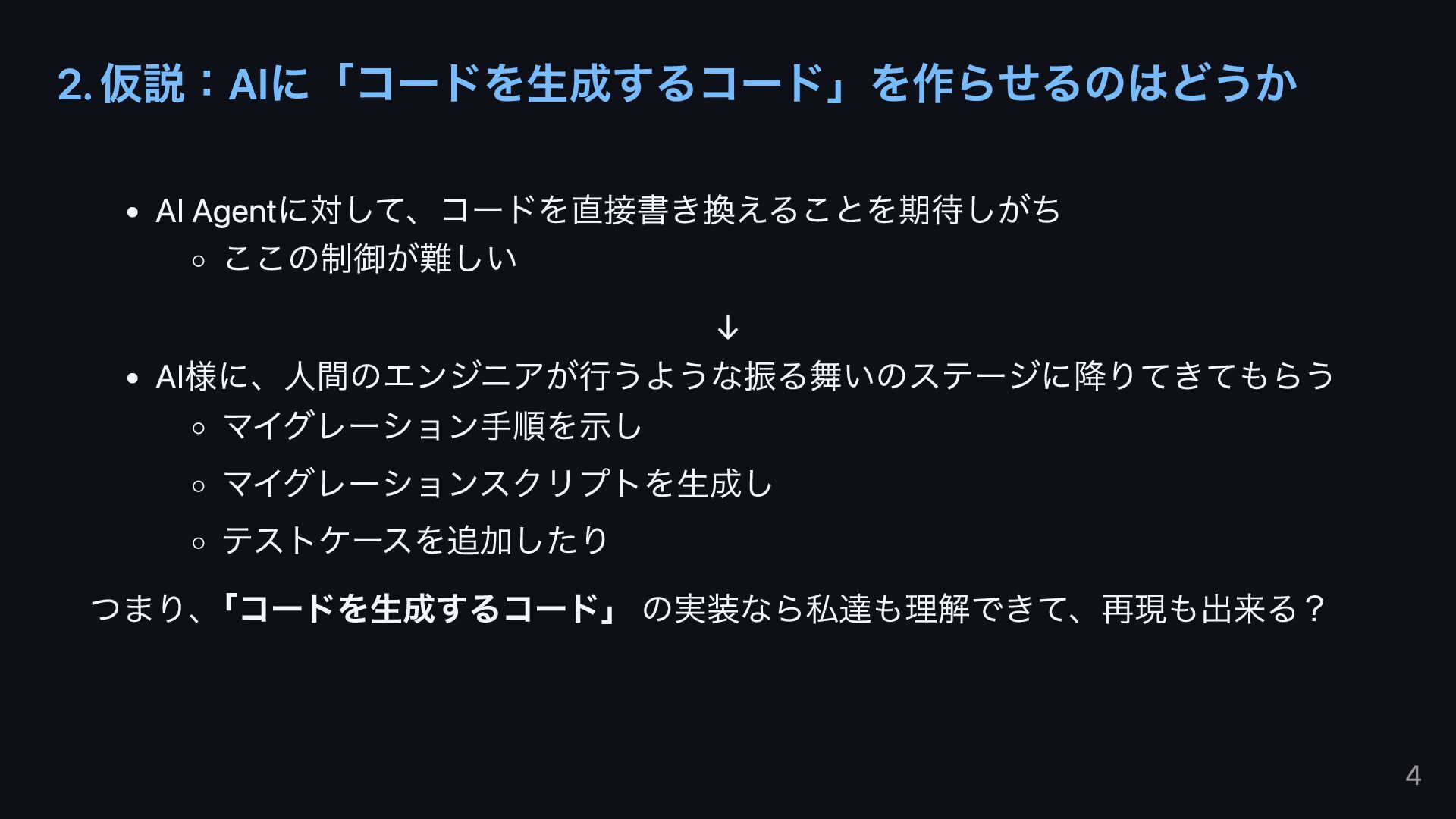 AI Agentに対して、コードを直接書き換えることを期待しがち ここの制御が難しい ↓ AI様に、人間のエンジニアが行うような振る舞いのステージに降りてきてもらう マイグレーション手順を示し マイグレーションスクリプトを生成し テストケースを追加したり つまり、 「コードを生成するコード」