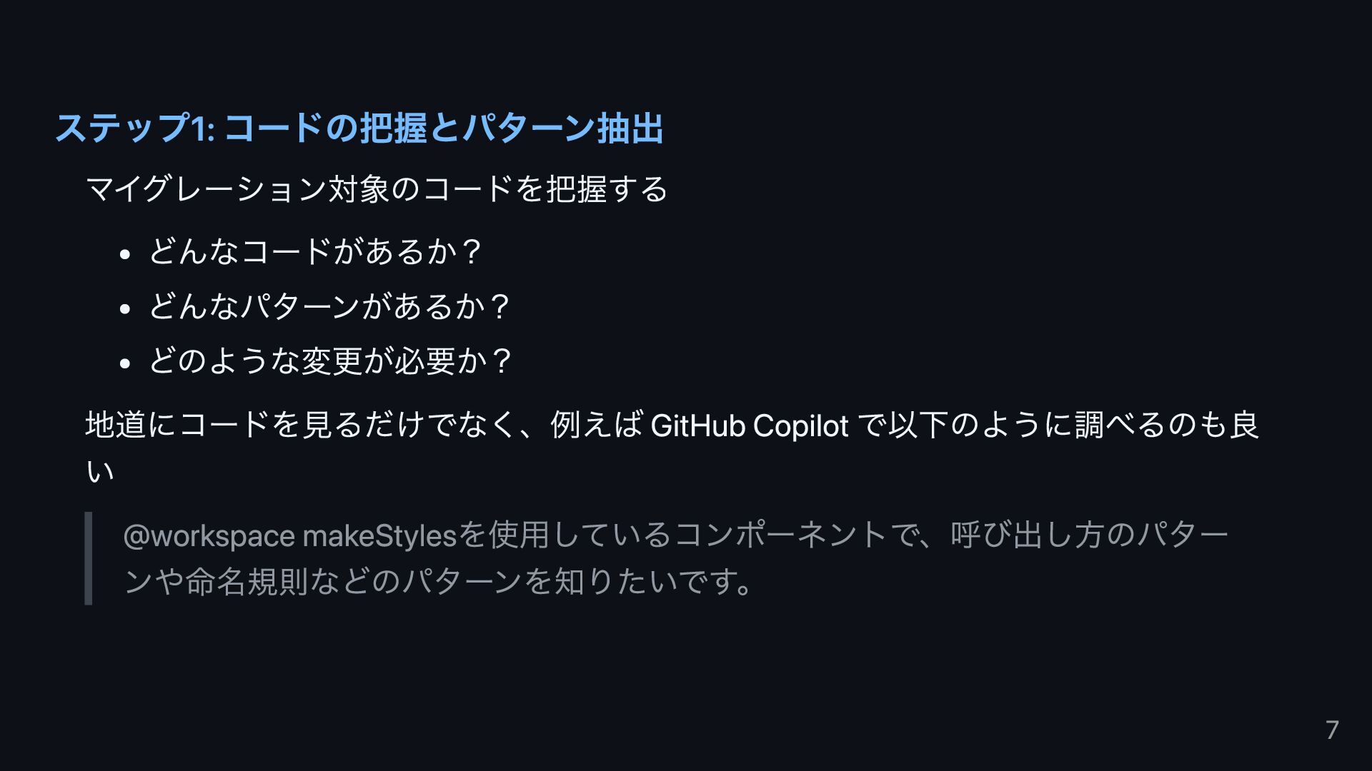 マイグレーション対象のコードを把握する どんなコードがあるか? どんなパターンがあるか? どのような変更が必要か? 地道にコードを見るだけでなく、例えば GitHub Copilot で以下のように調べるのも良 い @workspace