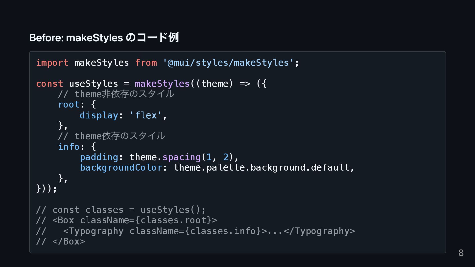 Before: makeStyles のコード例 import makeStyles from '@mui/styles/makeStyles'; const useStyles =