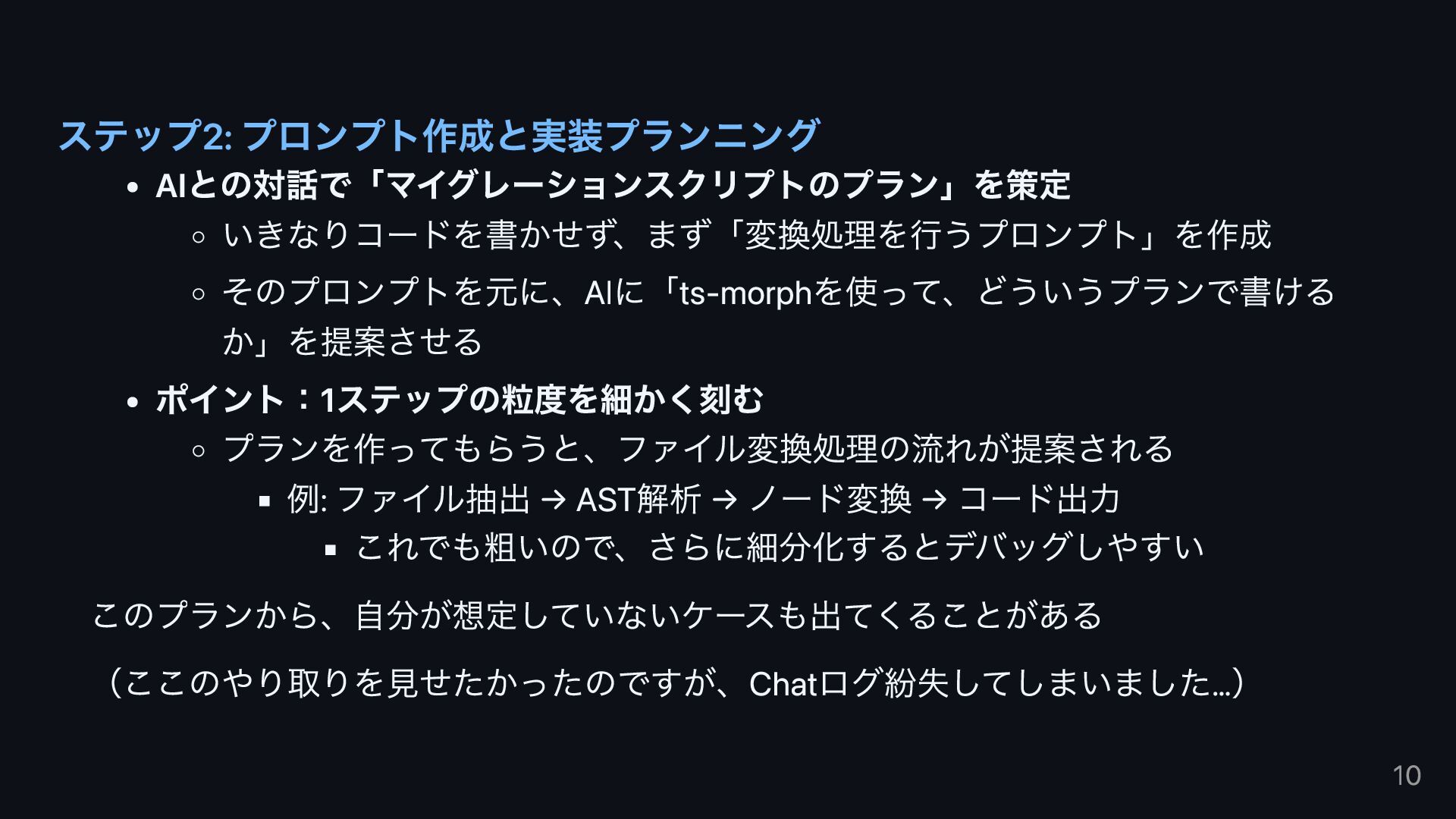 AIとの対話で「マイグレーションスクリプトのプラン」を策定 いきなりコードを書かせず、まず「変換処理を行うプロンプト」を作成 そのプロンプトを元に、AIに「ts-morphを使って、どういうプランで書ける か」を提案させる ポイント:1ステップの粒度を細かく刻む プランを作ってもらうと、ファイル変換処理の流れが提案される 例: ファイル抽出 → AST解析