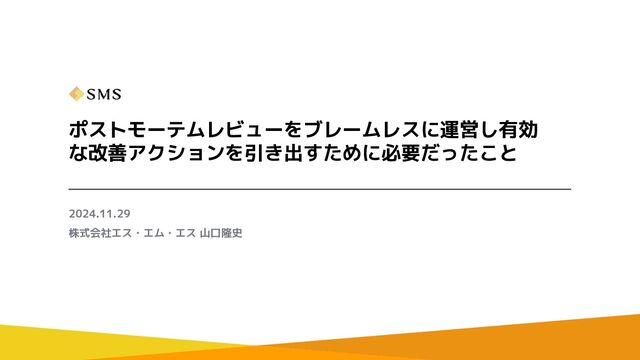 「ポストモーテムレビューをブレームレスに運営し有効な改善アクションを引き出すために必要だったこと」という発表は 「個人にフォーカスしがちな、なぜなぜ分析からの脱却」です これは「ブレームレスな原因追求をすること」で、 「再発防止につながる有効な改善策が引き出せる」 ことを発表します