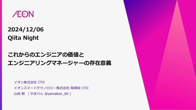2024/12/06 Qiita Night これからのエンジニアの価値と エンジニアリングマネージャーの存在意義 イオン株式会社 CTO イオンスマートテクノロジー株式会社 取締役 CTO