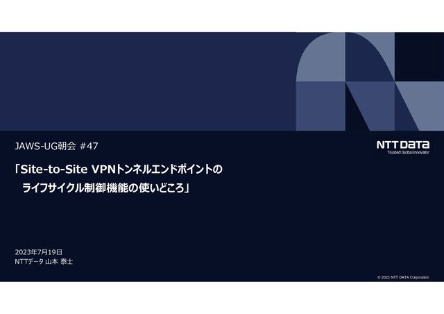 JAWS-UG朝会 #47 「Site-to-Site VPNトンネルエンドポイントの ライフサイクル制御機能の使いどころ」 2023年7月19日 NTTデータ 山本 泰士
