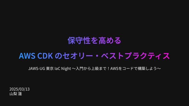 Construct ID の決定が外的要因に作用される ▶︎ 意図しないところで Construct ID が変わり、論理 ID も変わる 論理 ID の安定性 作成後のリソースの論理IDの変更は避けてください。AWS CloudFormationは論理IDによってリソースを識別します。したがって、リソ ースの論理IDを変更すると、AWS CloudFormationは新しい論理IDで新しいリソースを作成し、既存のリソースを削除します。リソース の種類によっては、サービスの中断、データ損失、またはその両方が発生する可能性があります。 引用(翻訳したもの): https://docs.aws.amazon.com/cdk/v2/guide/identifiers.html this.bucket = new Bucket(this, id + "Bucket");