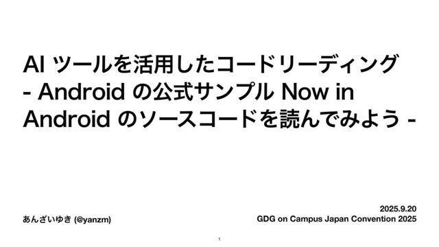 ͋Μ͍͟Ώ͖ (@yanzm) "*πʔϧΛ׆༻ͨ͠ίʔυϦʔσΟϯά "OESPJEͷެࣜαϯϓϧ/PXJO "OESPJEͷιʔείʔυΛಡΜͰΈΑ͏ 1 2025.9.20 GDG on Campus