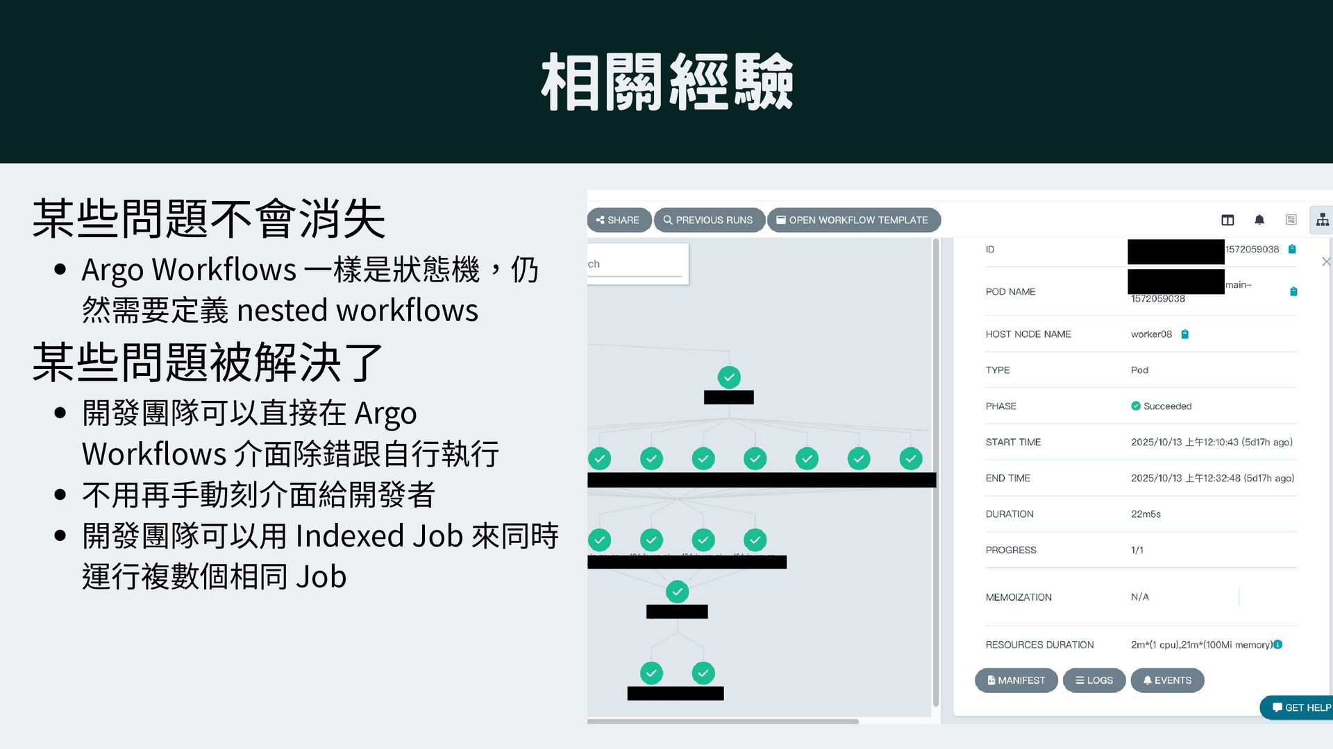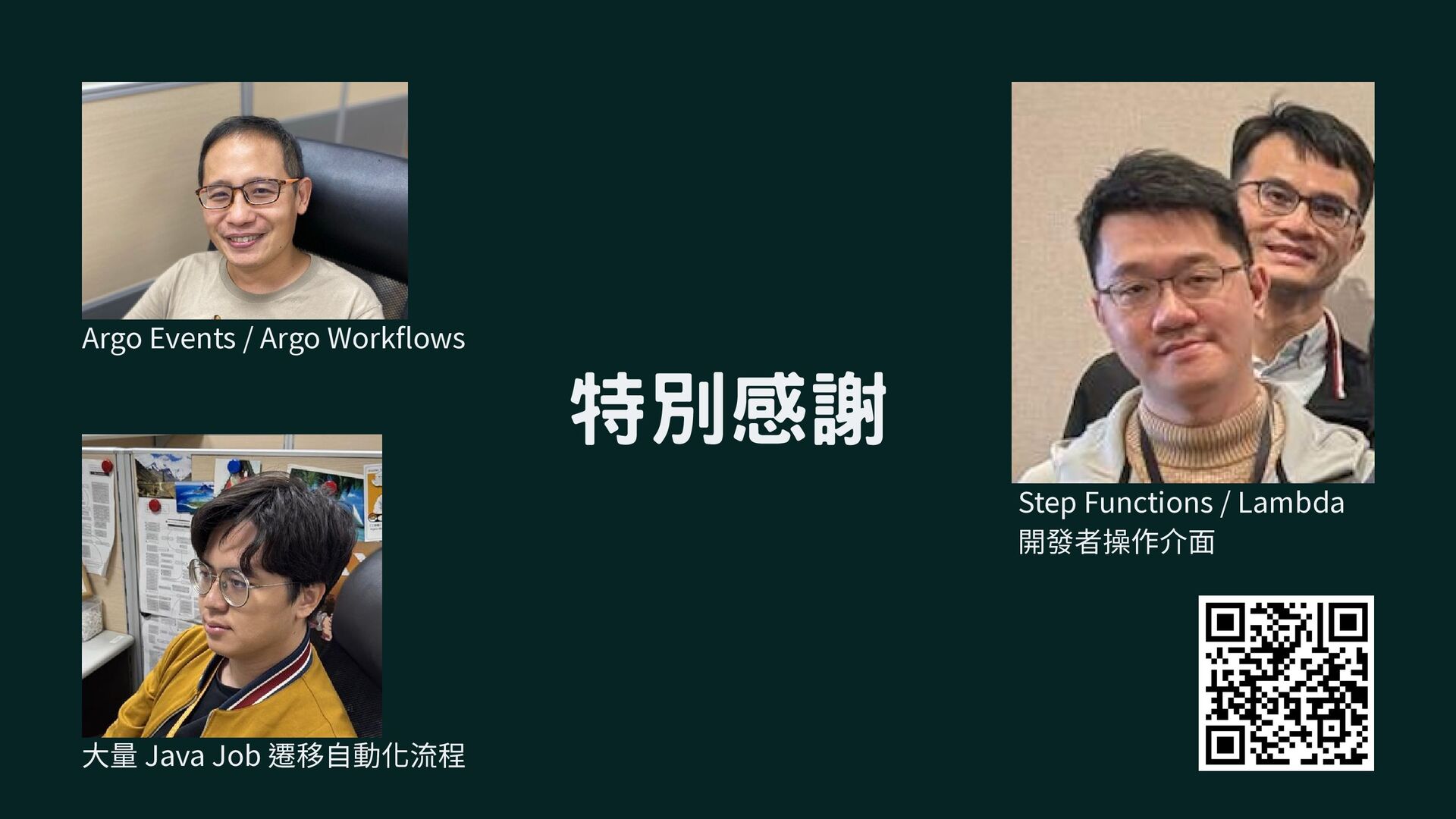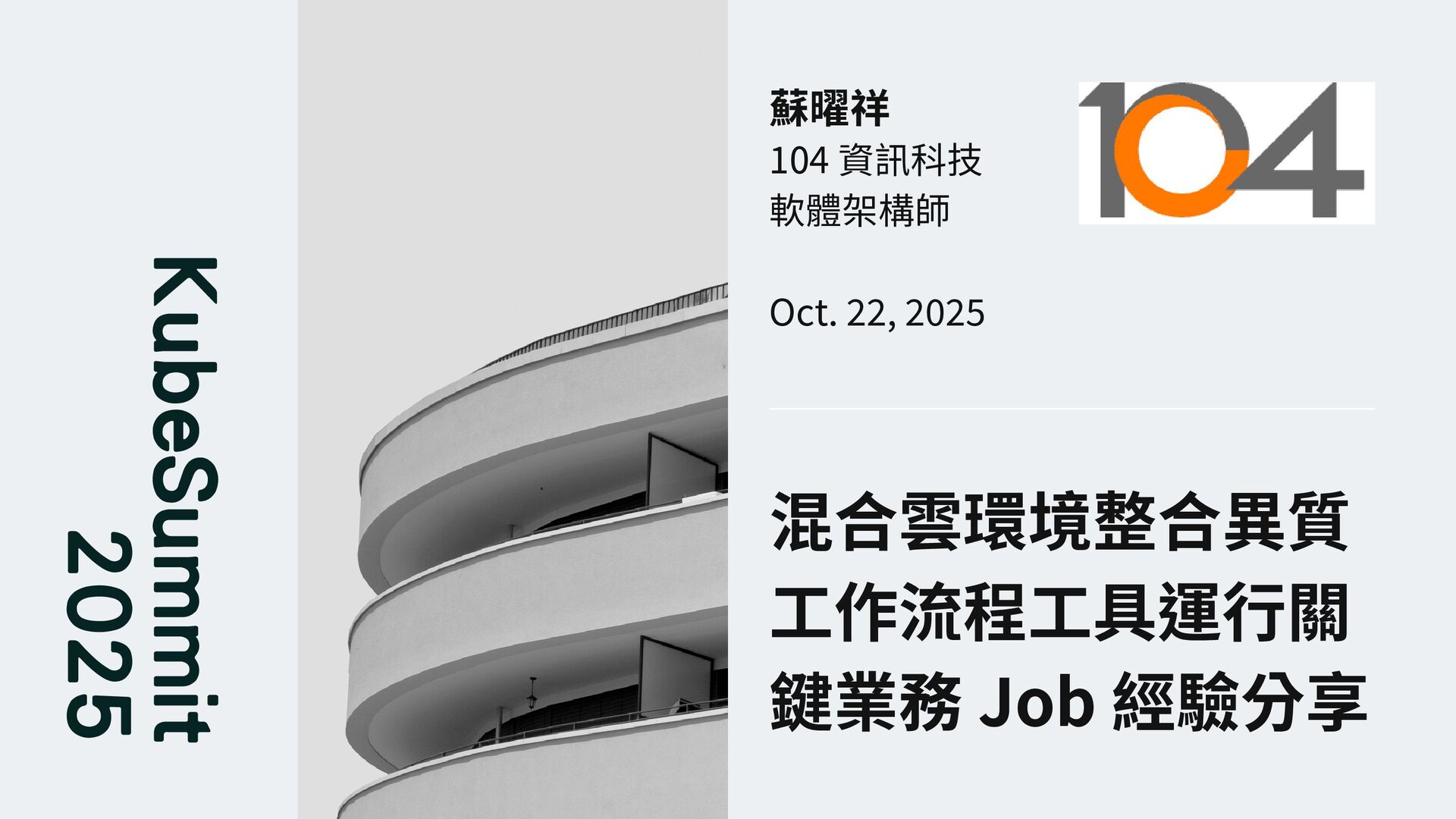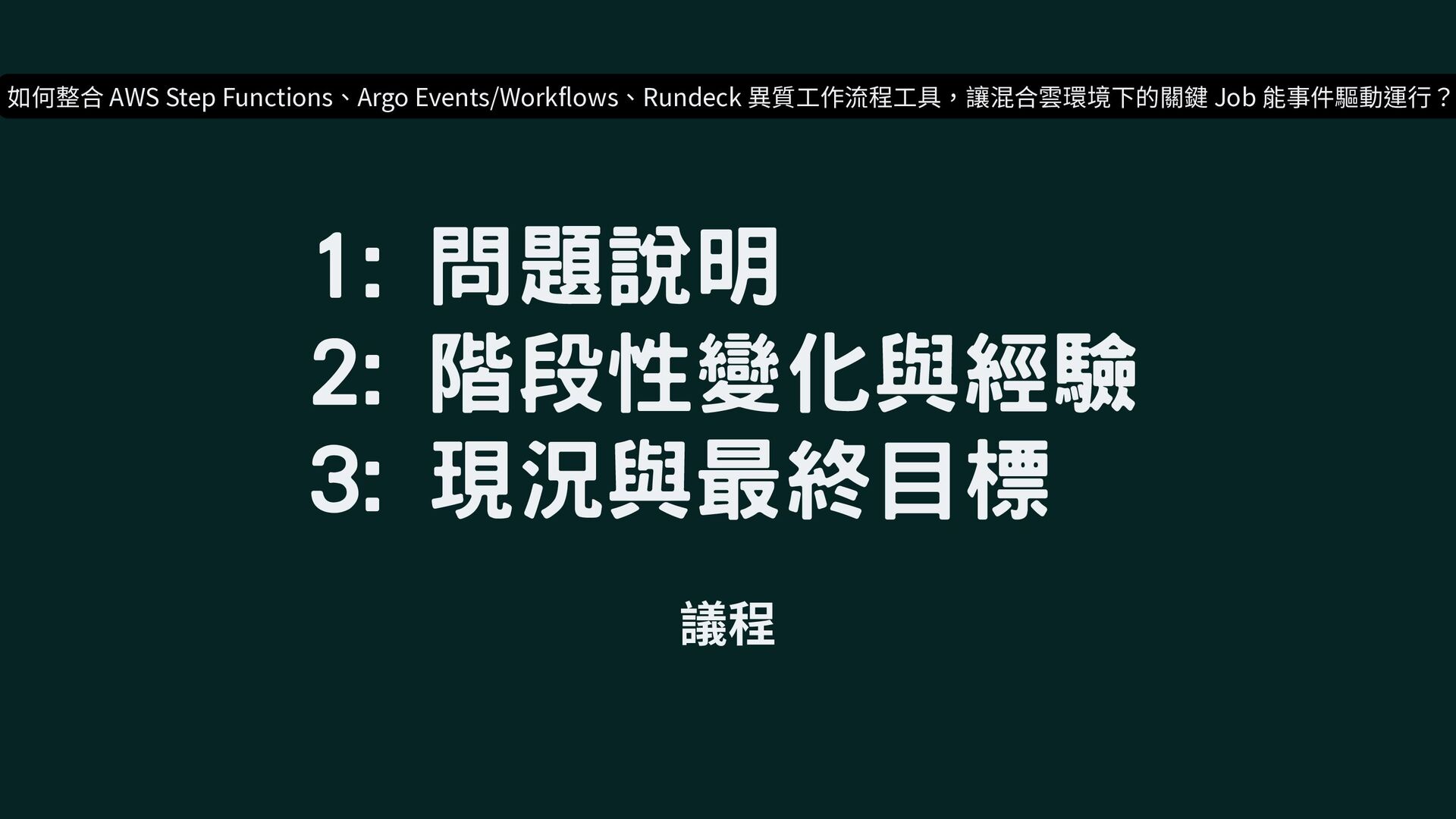 本演講將分享 104 Kubernetes 團隊如何整合 AWS Step Functions、Argo Events、Argo Workflows 及 Rundeck 來運行關鍵業務工作流程,透過 Step Functions 為流程控制器,指揮運行在雲端與地端的多個工作流程工具(Argo Workflows、Rundeck)。