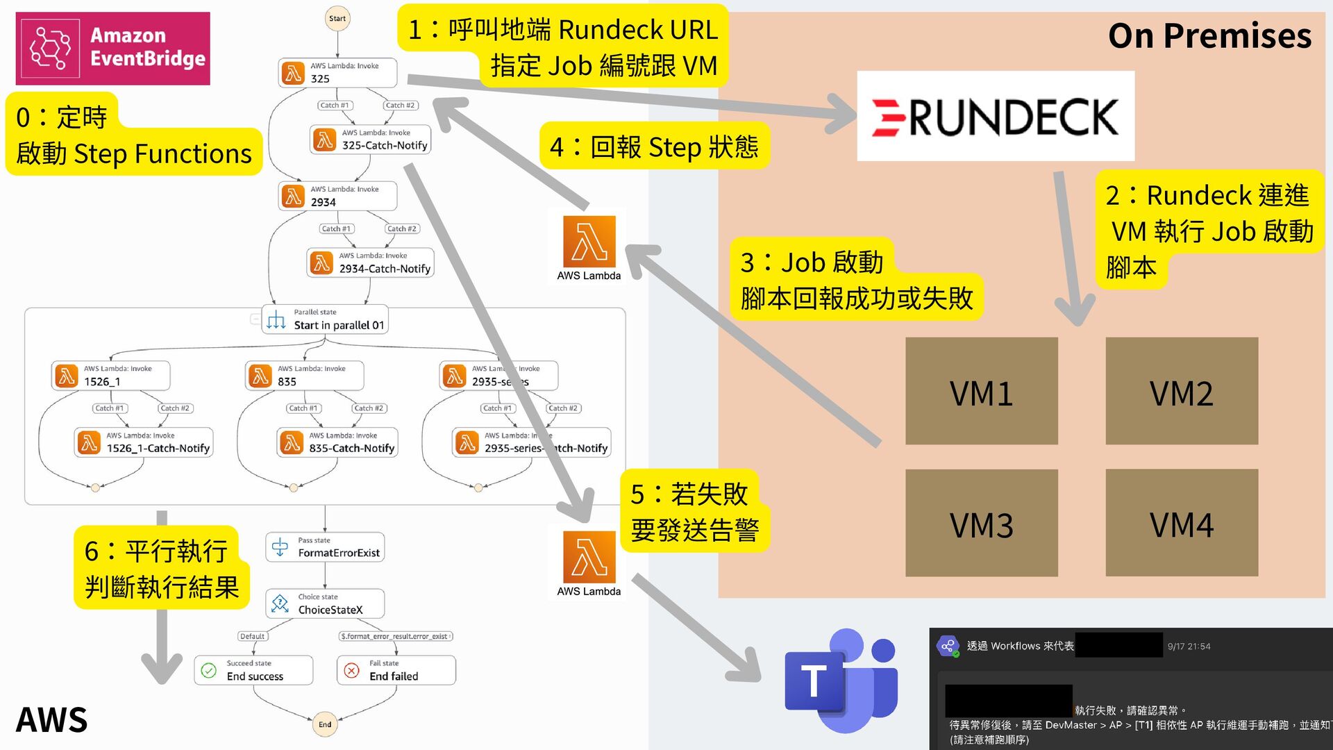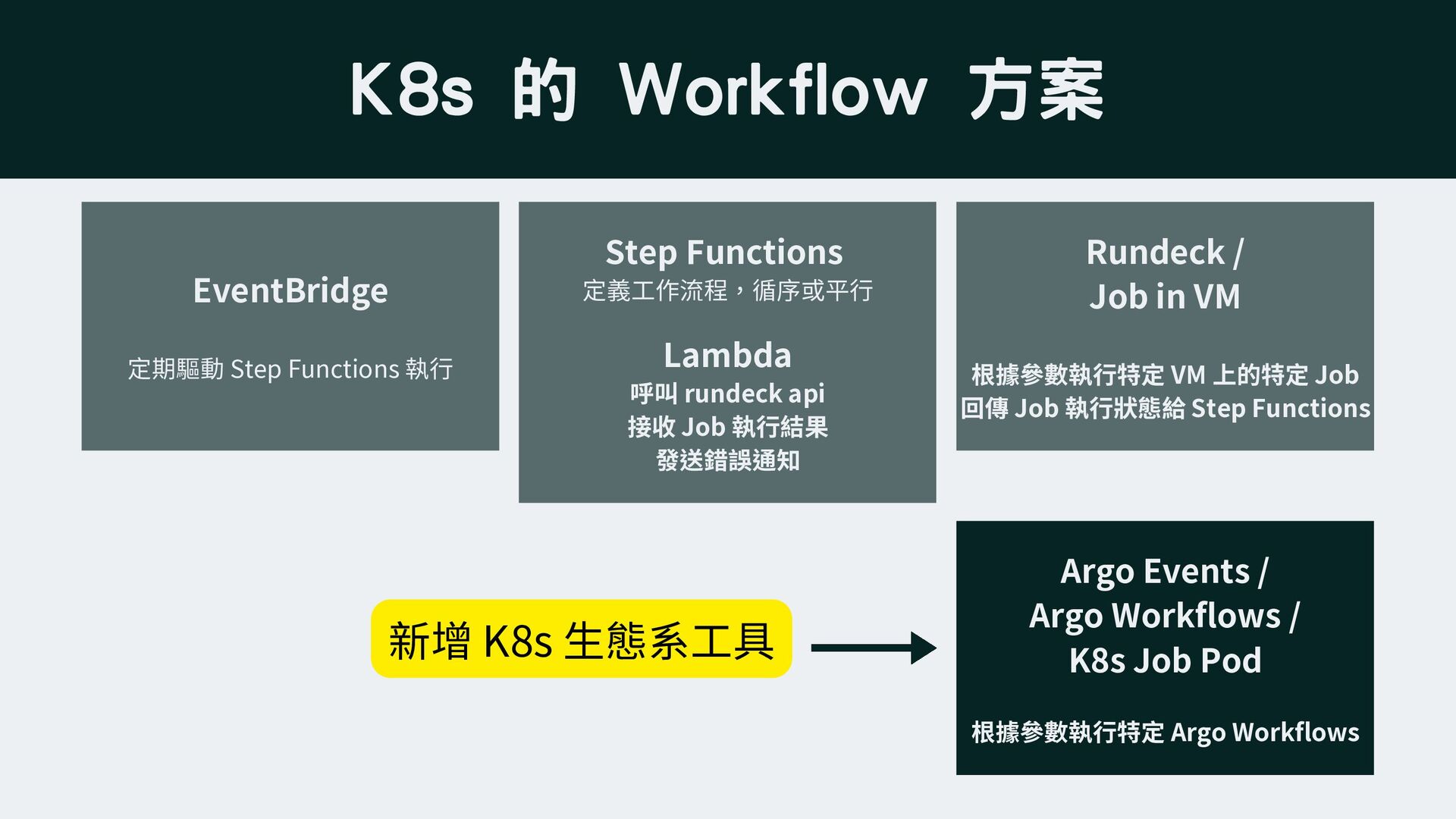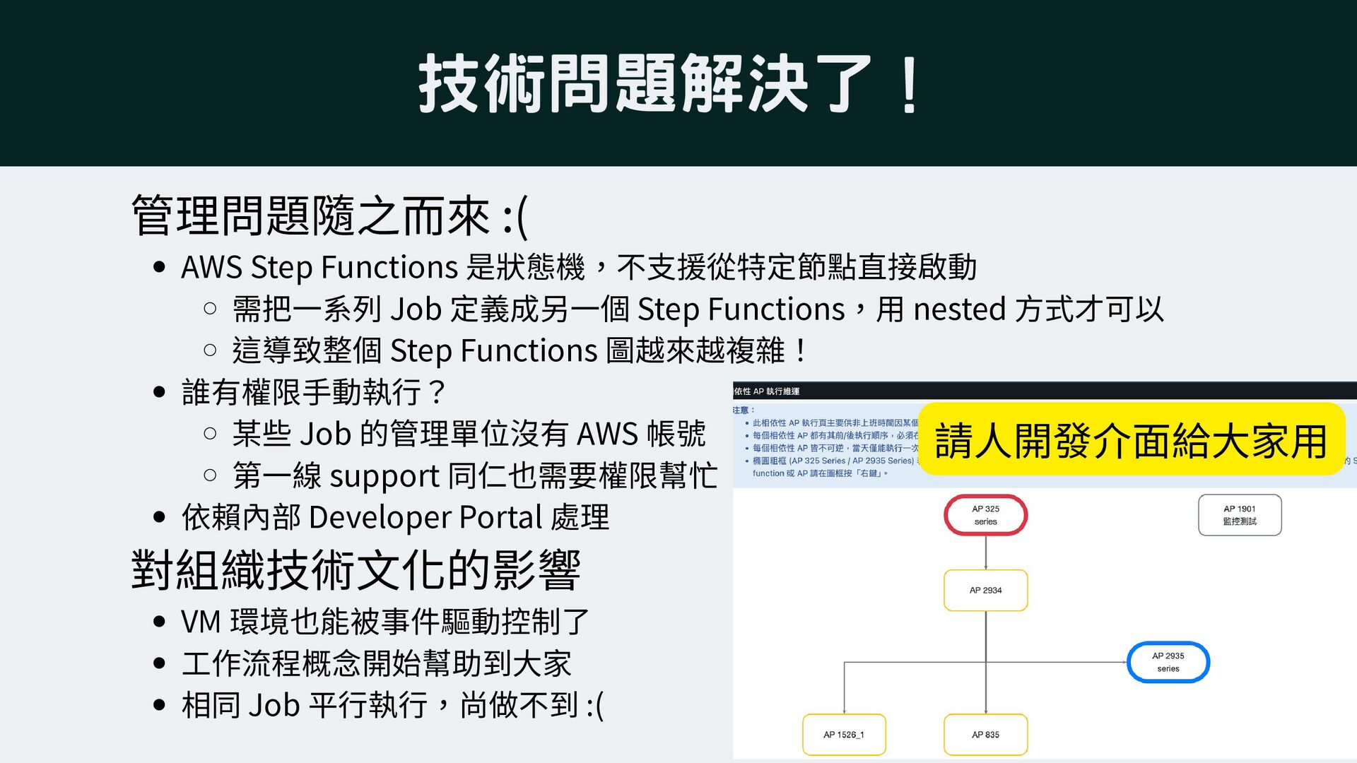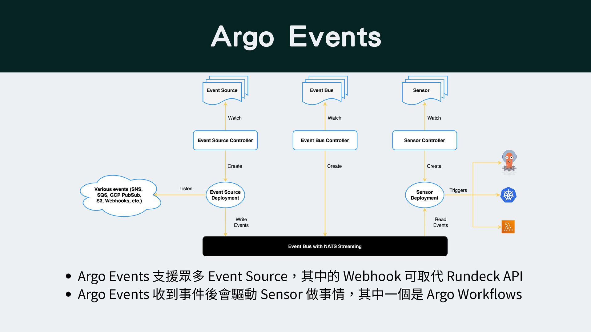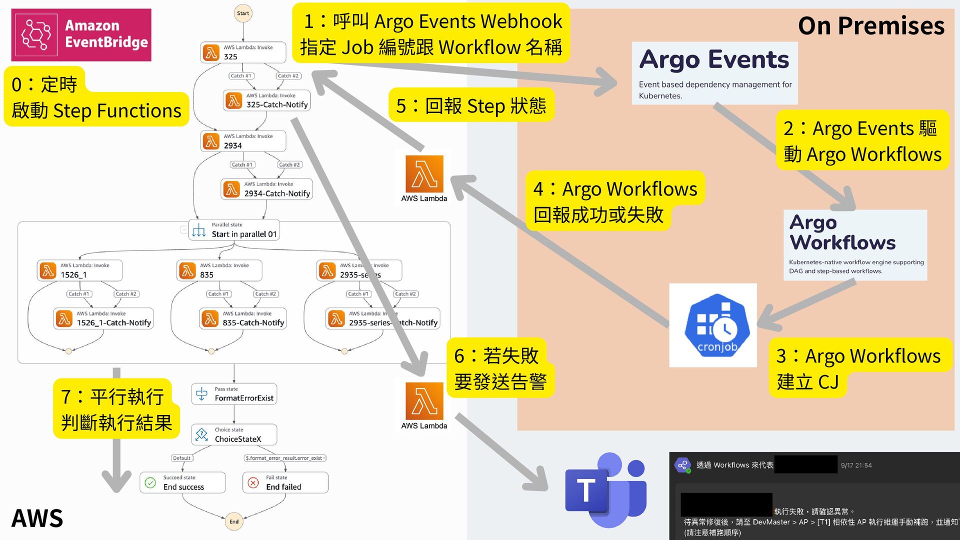 本演講將分享 104 Kubernetes 團隊如何整合 AWS Step Functions、Argo Events、Argo Workflows 及 Rundeck 來運行關鍵業務工作流程,透過 Step Functions 為流程控制器,指揮運行在雲端與地端的多個工作流程工具(Argo Workflows、Rundeck)。