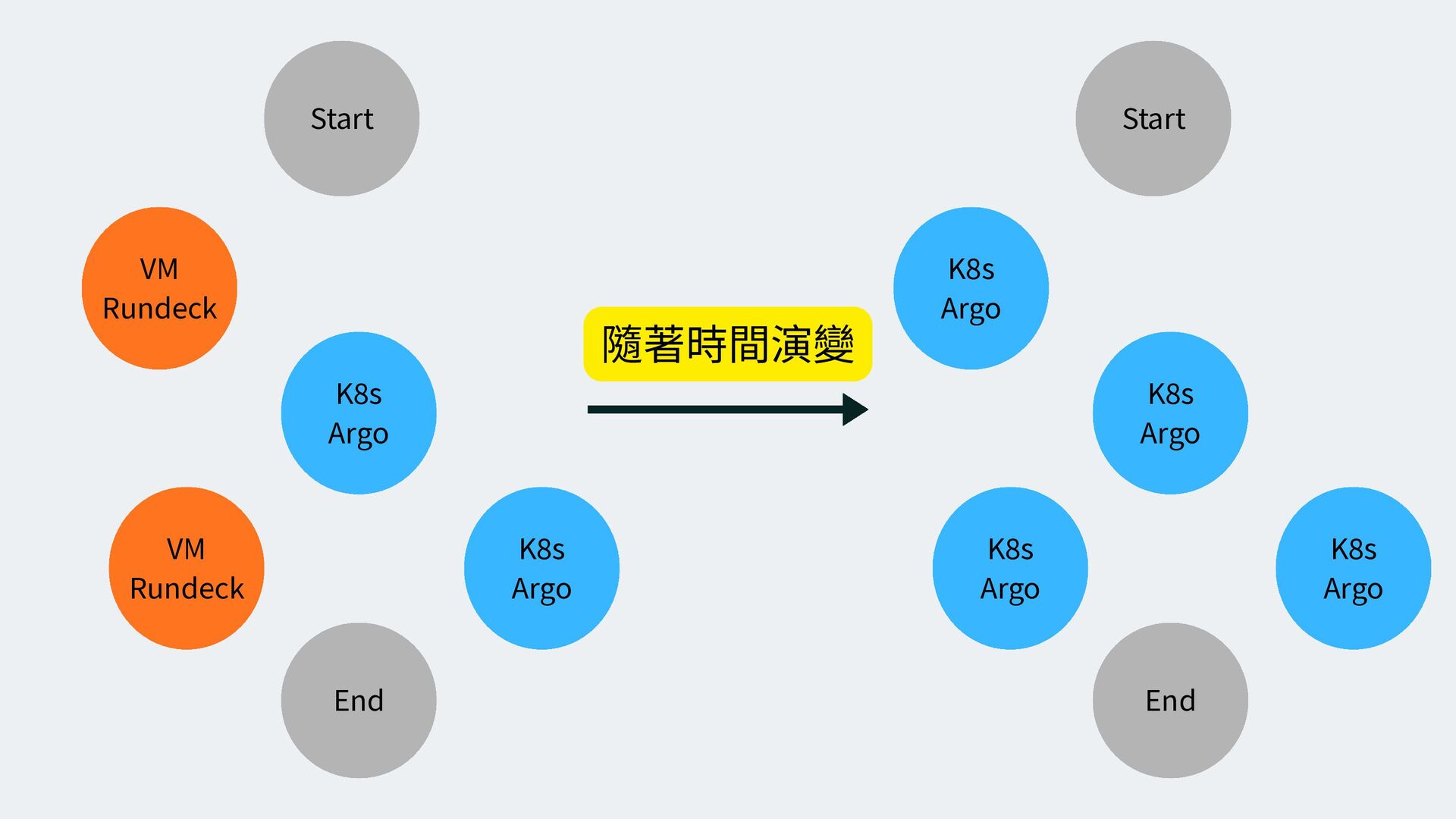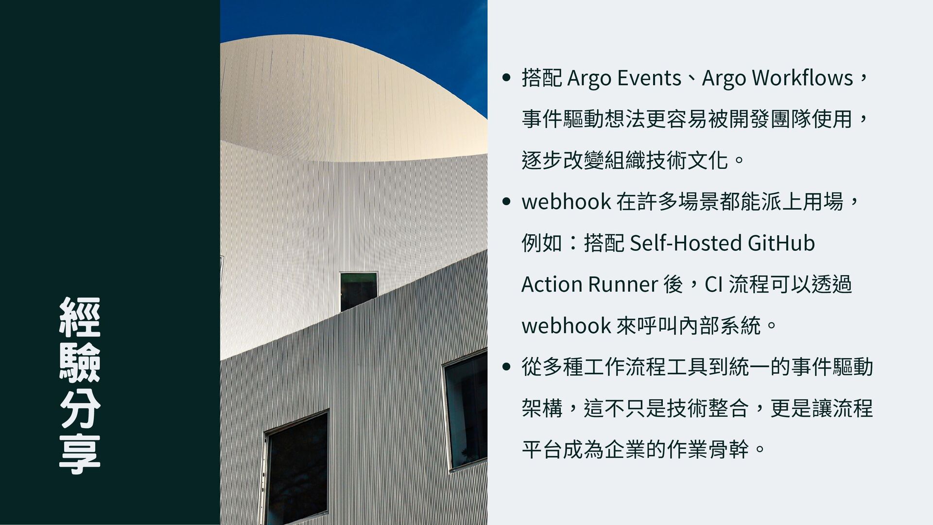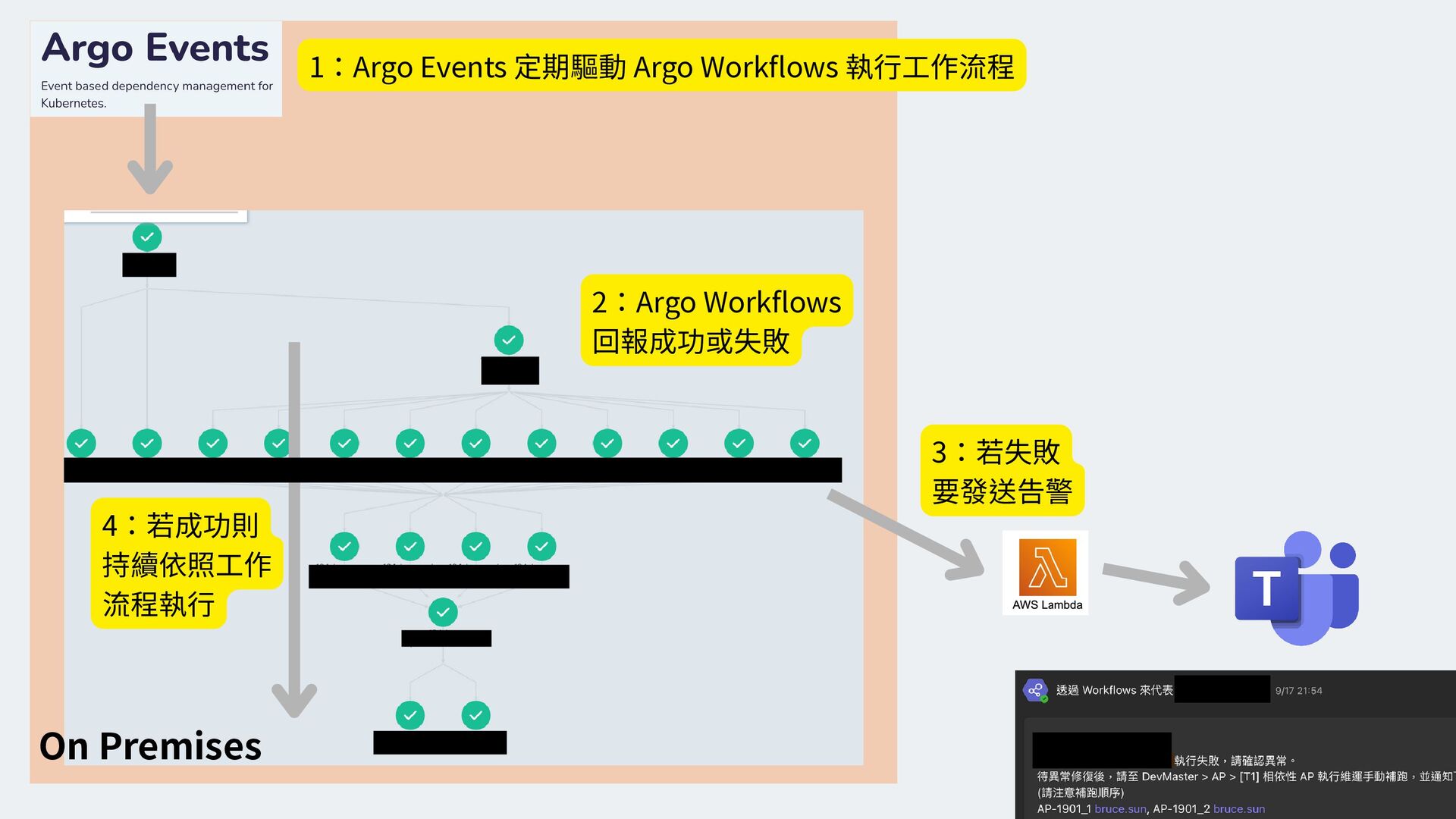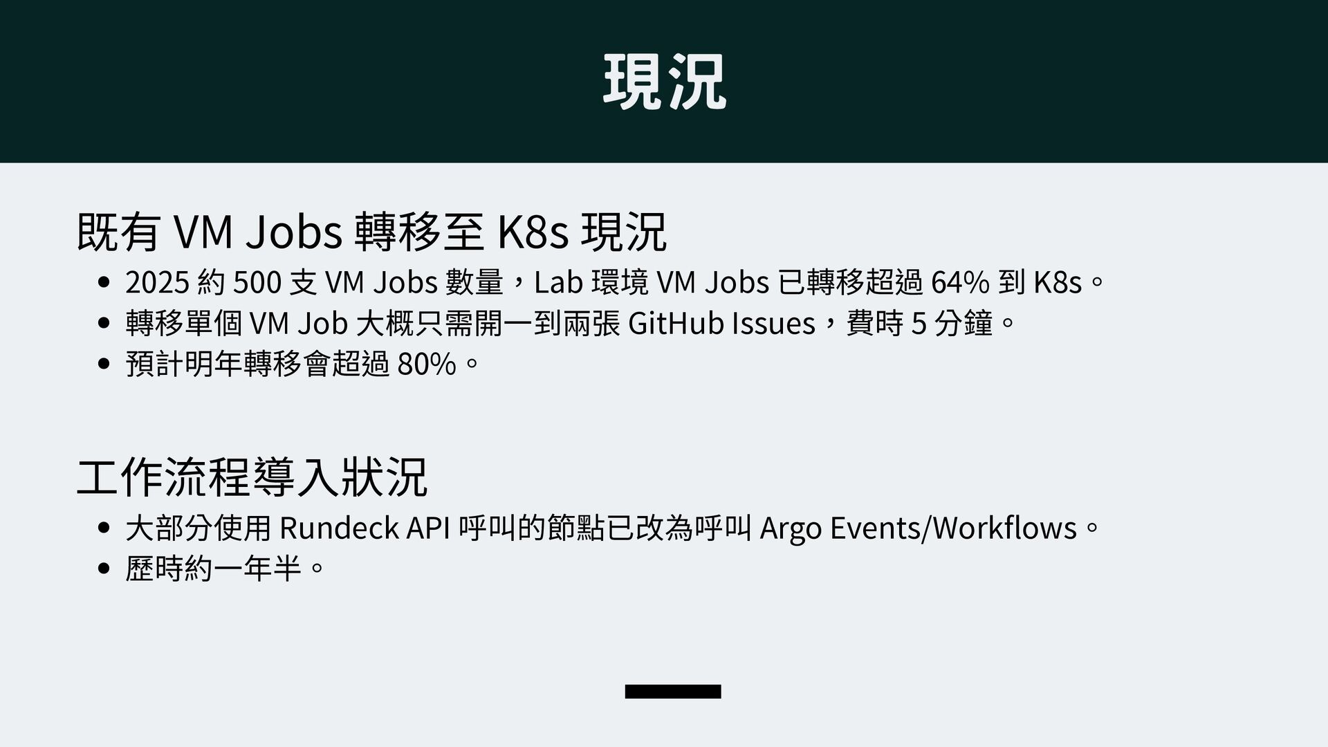 本演講將分享 104 Kubernetes 團隊如何整合 AWS Step Functions、Argo Events、Argo Workflows 及 Rundeck 來運行關鍵業務工作流程,透過 Step Functions 為流程控制器,指揮運行在雲端與地端的多個工作流程工具(Argo Workflows、Rundeck)。