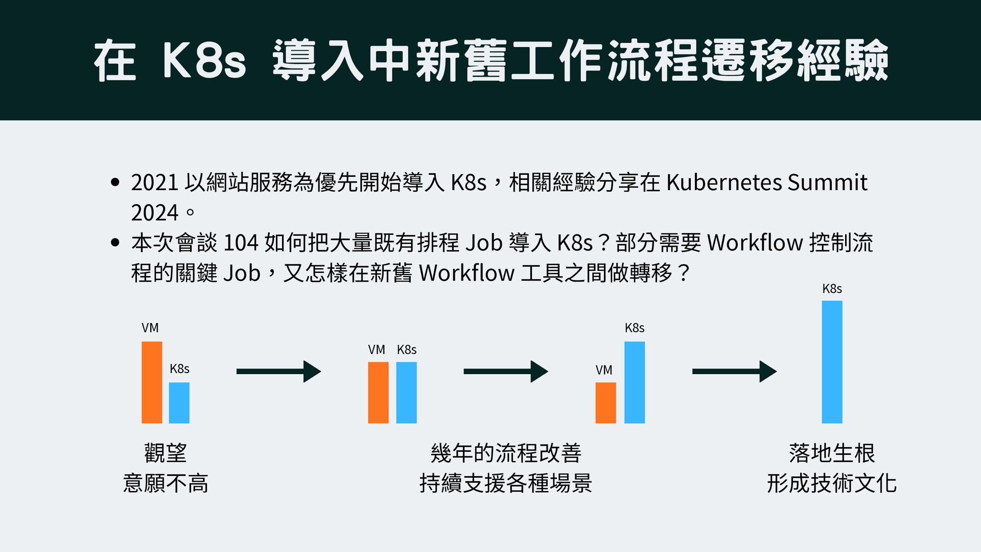在一個混合雲環境中,各團隊使用不同工作流程工具是常見樣態,如何整合由多個開發團隊使用,運行在公司內網與公有雲、容器與虛擬機的異質環境,是近幾年 104 Kubernetes 團隊在實務上遇到的難題。