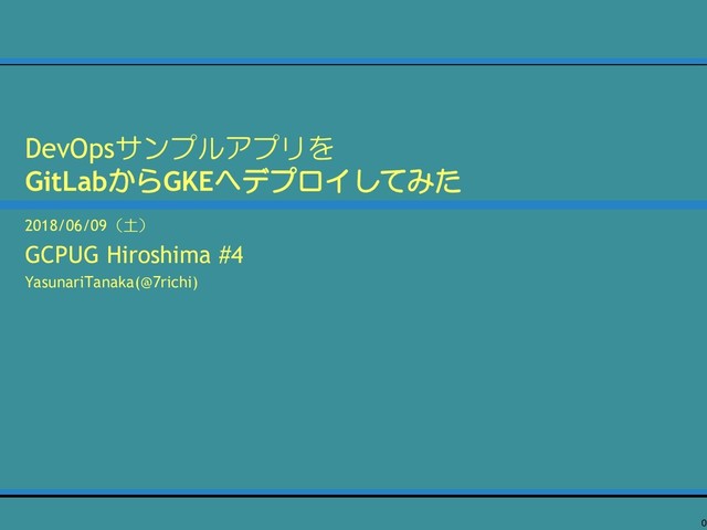 0 DevOpsサンプルアプリを GitLabからGKEへデプロイしてみた 2018/06/09(土) GCPUG Hiroshima #4 YasunariTanaka(@7richi)