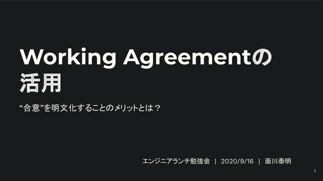 Working Agreementの 活用 “合意”を明文化することのメリットとは? エンジニアランチ勉強会 | 2020/9/16 | 面川泰明 1