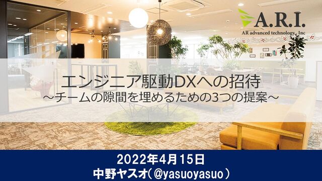 Copyright ©A.R.I. All Rights reserved. 1 エンジニア駆動DXへの招待 ~チームの隙間を埋めるための3つの提案~ 2022年4月15日 中野ヤスオ(@yasuoyasuo)