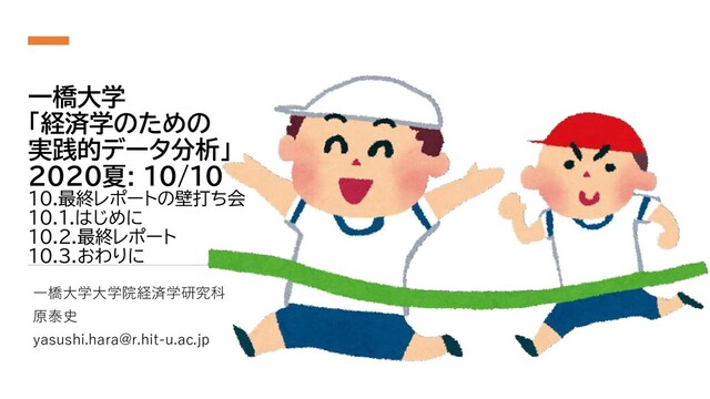 一橋大学 「経済学のための 実践的データ分析」 2020夏: 10/10 10.最終レポートの壁打ち会 10.1.はじめに 10.2.最終レポート 10.3.おわりに 一橋大学大学院経済学研究科