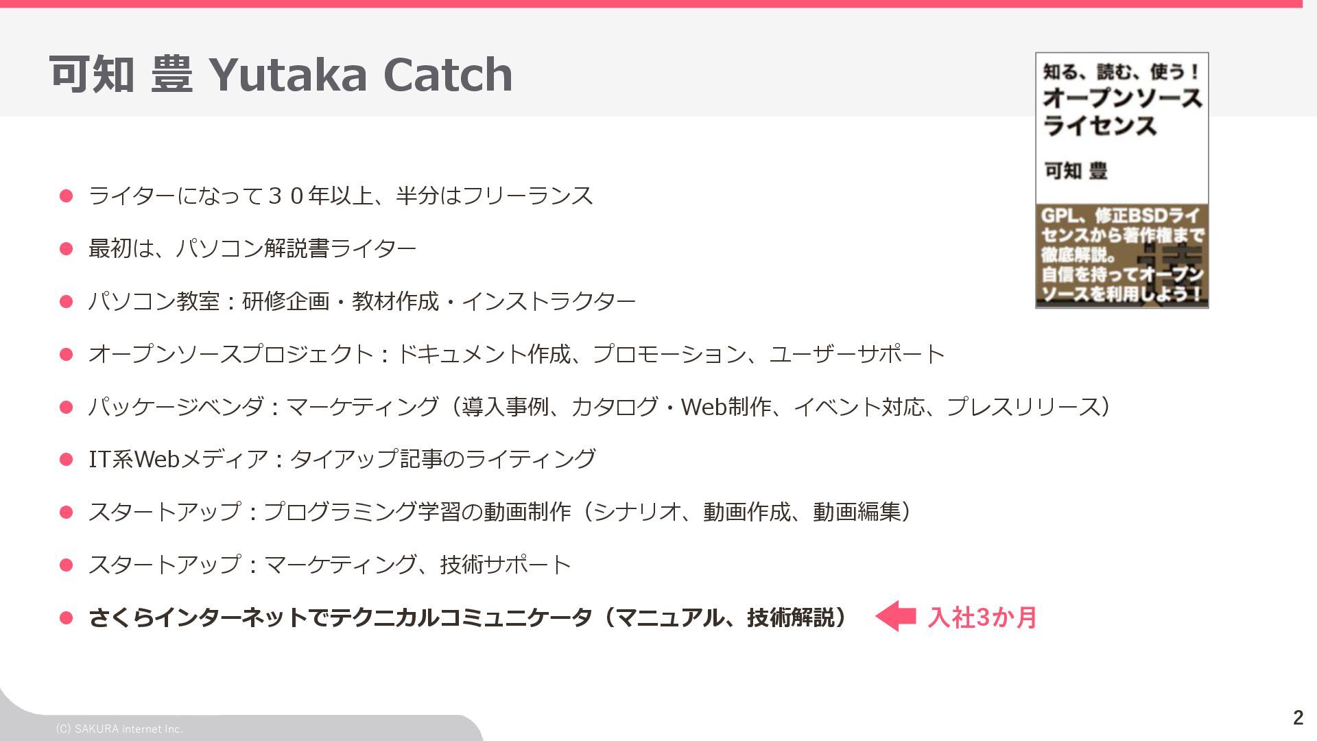 豊 Yutaka Catch ⚫ ライターになって30年以上、半分はフリーランス ⚫ 最初は、パソコン解説書ライター ⚫ パソコン教室:研修企画・教材作成・インストラクター ⚫ オープンソースプロジェクト:ドキュメント作成、プロモーション、ユーザーサポート ⚫ パッケージベンダ:マーケティング(導入事例、カタログ・Web制作、イベント対応、プレスリリース) ⚫ IT系Webメディア:タイアップ記事のライティング ⚫ スタートアップ:プログラミング学習の動画制作(シナリオ、動画作成、動画編集) ⚫ スタートアップ:マーケティング、技術サポート ⚫ さくらインターネットでテクニカルコミュニケータ(マニュアル、技術解説) 入社3か月