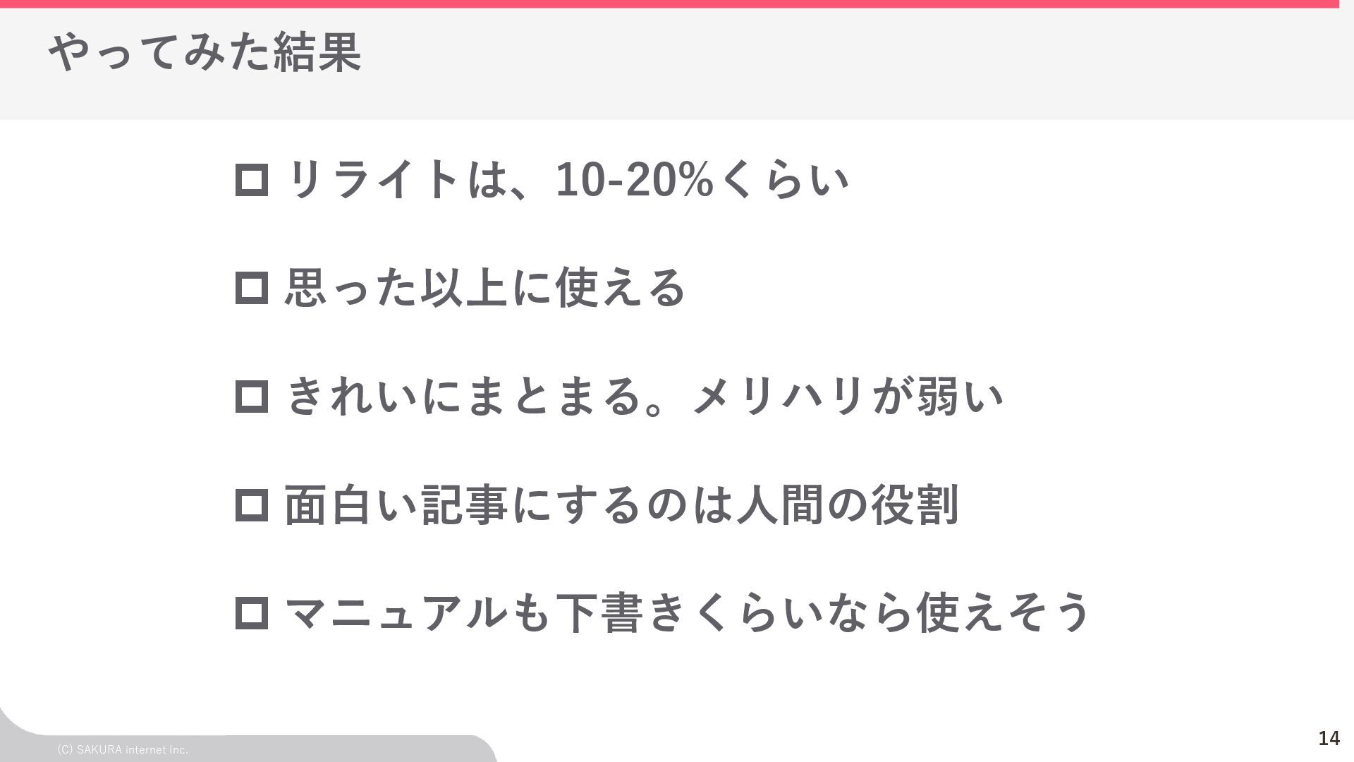 リライトは、10-20%くらい  思った以上に使える  きれいにまとまる。メリハリが弱い  面白い記事にするのは人間の役割  マニュアルも下書きくらいなら使えそう