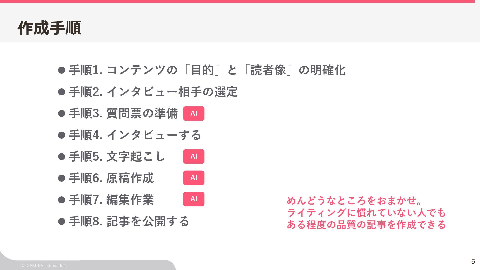 ⚫ 手順1. コンテンツの「目的」と「読者像」の明確化 ⚫ 手順2. インタビュー相手の選定 ⚫ 手順3. 質問票の準備 ⚫ 手順4. インタビューする ⚫ 手順5. 文字起こし ⚫ 手順6. 原稿作成 ⚫ 手順7. 編集作業 ⚫ 手順8. 記事を公開する AI AI AI AI めんどうなところをおまかせ。 ライティングに慣れていない人でも ある程度の品質の記事を作成できる