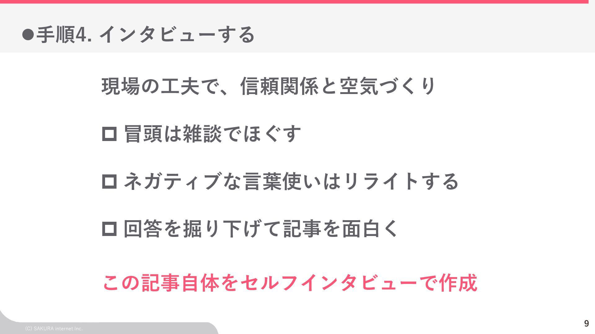 インタビューする 現場の工夫で、信頼関係と空気づくり  冒頭は雑談でほぐす  ネガティブな言葉使いはリライトする  回答を掘り下げて記事を面白く この記事自体をセルフインタビューで作成