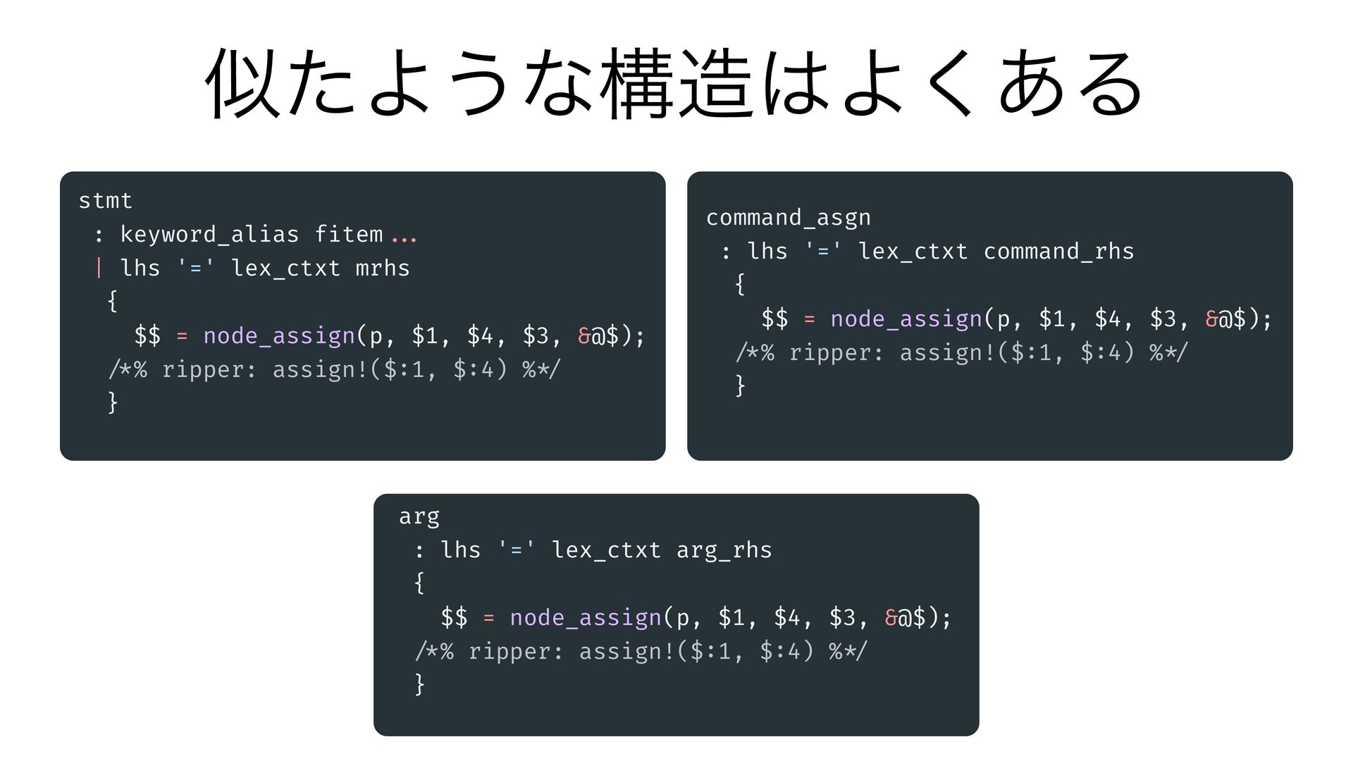 | lhs '=' lex_ctxt mrhs { $$ = node_assign(p, $1, $4, $3, &@$); / * % ripper: assign!($ : 1, $ : 4) % * / } command_asgn : lhs '=' lex_ctxt command_rhs { $$ = node_assign(p, $1, $4, $3, &@$); / * % ripper: assign!($ : 1, $ : 4) % * / } arg : lhs '=' lex_ctxt arg_rhs { $$ = node_assign(p, $1, $4, $3, &@$); / * % ripper: assign!($ : 1, $ : 4) % * / }