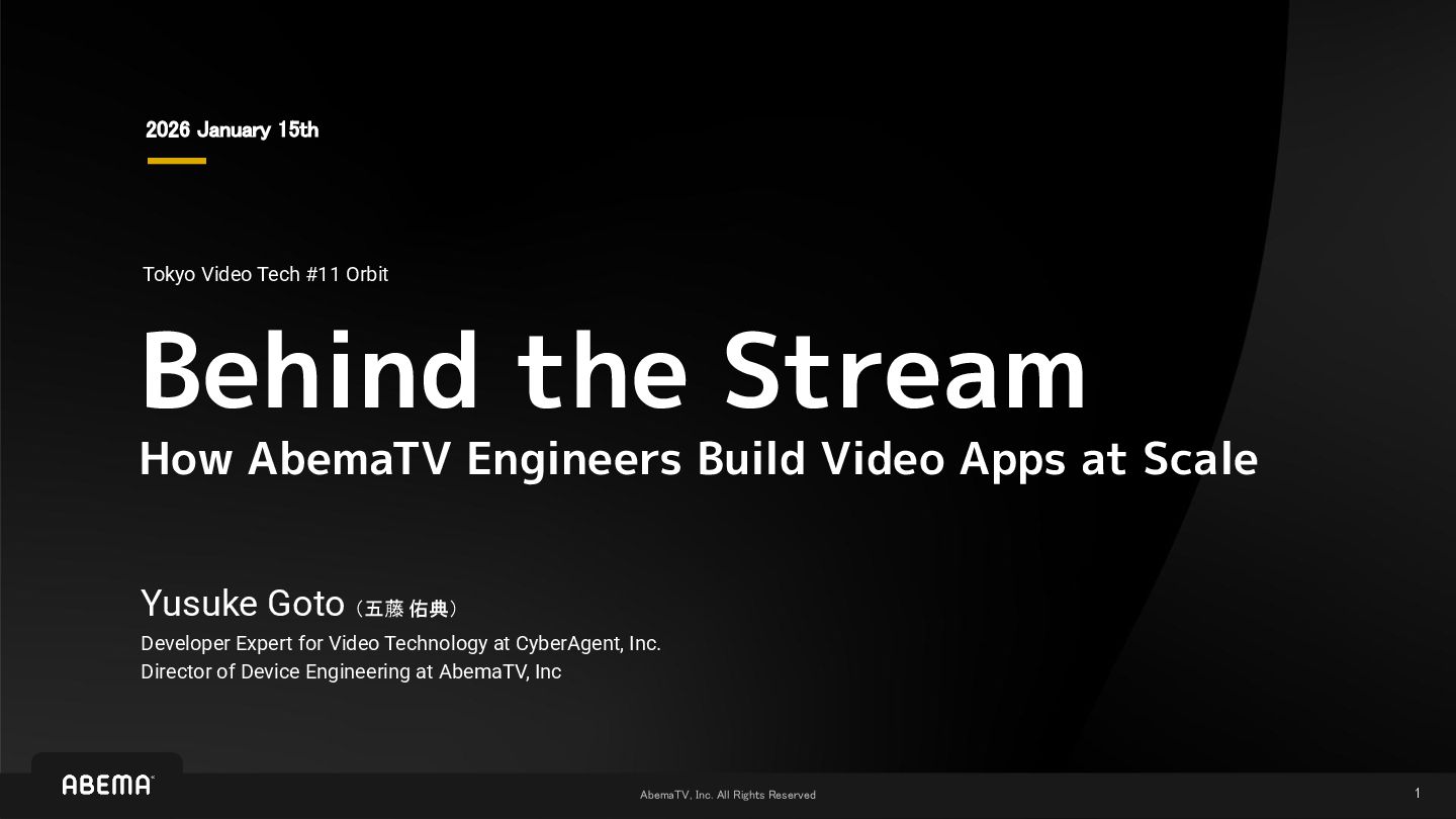 1 Behind the Stream How AbemaTV Engineers Build Video Apps at Scale 2026 January 15th Tokyo Video Tech #11 Orbit Yusuke Goto (五藤 佑典) Developer Expert for Video Technology at CyberAgent, Inc. Director of Device Engineering at AbemaTV, Inc