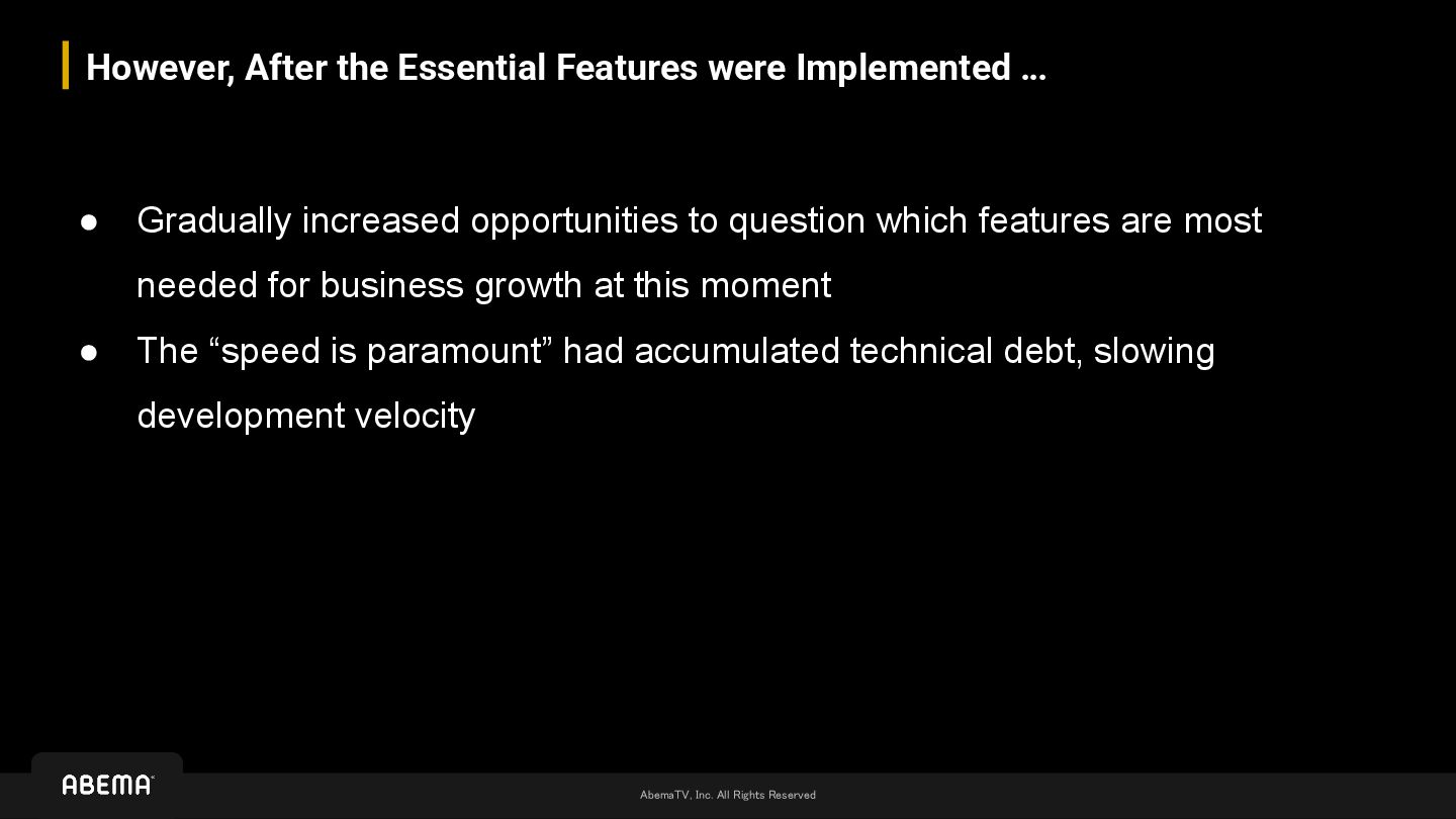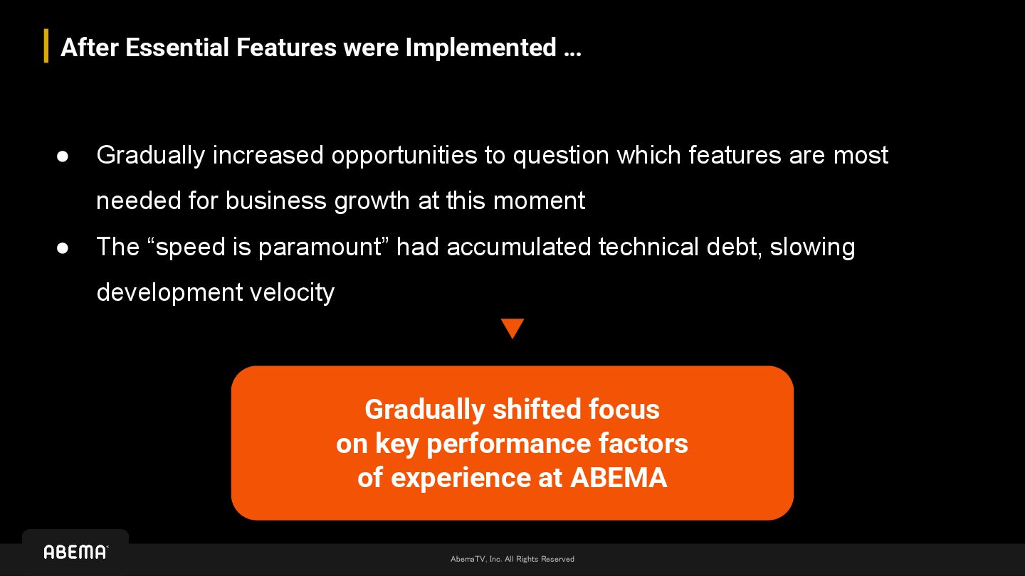 … • Gradually increased opportunities to question which features are most needed for business growth at this moment • The “speed is paramount” had accumulated technical debt, slowing development velocity Gradually shifted focus on key performance factors of experience at ABEMA