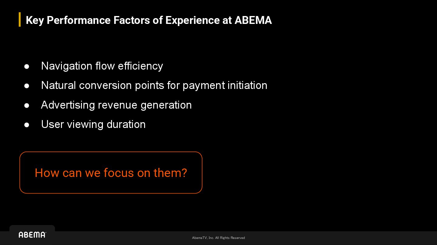 at ABEMA • Navigation flow efficiency • Natural conversion points for payment initiation • Advertising revenue generation • User viewing duration How can we focus on them?