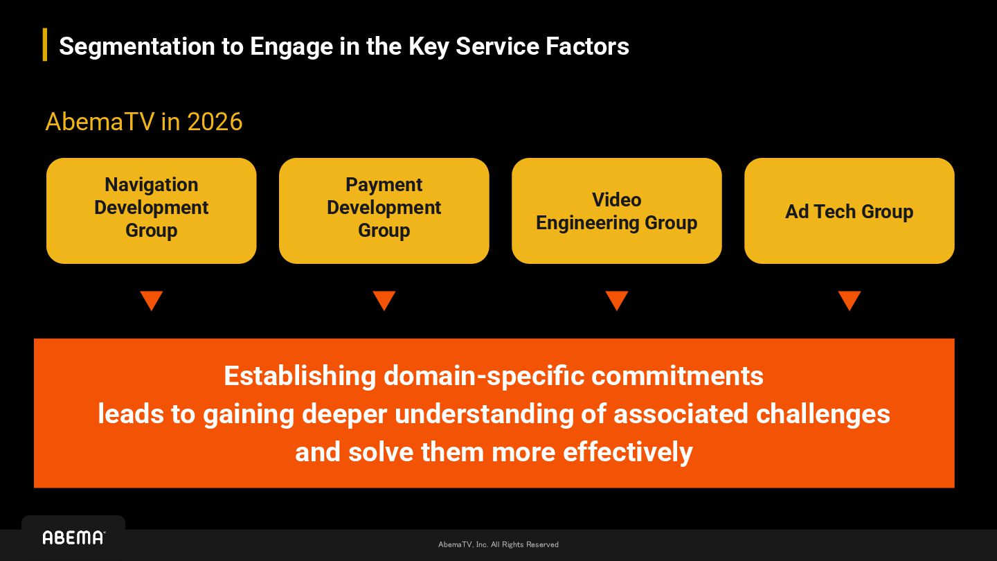 Key Service Factors AbemaTV in 2026 Navigation Development Group Ad Tech Group Payment Development Group Video Engineering Group Establishing domain-specific commitments leads to gaining deeper understanding of associated challenges and solve them more effectively