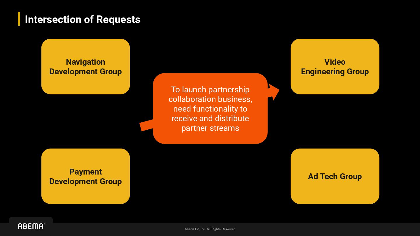 Group Payment Development Group Video Engineering Group Ad Tech Group Want to quickly finalize payment system changes and conduct early testing of partner’s stream reception and playback