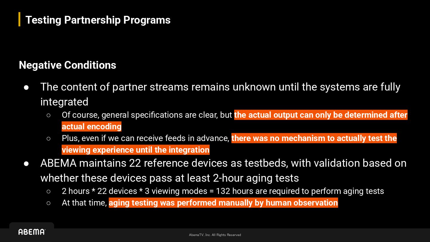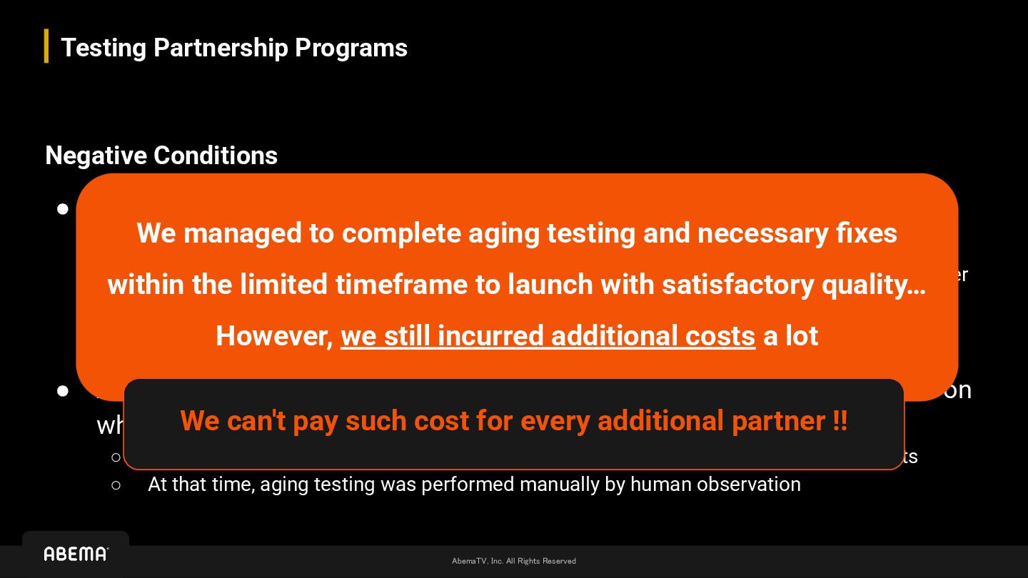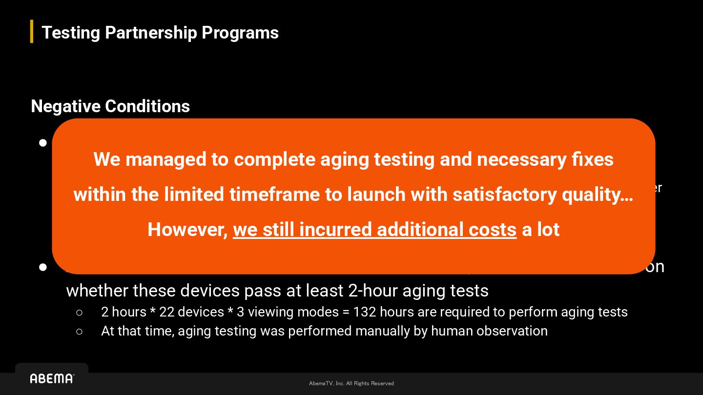 • The content of partner streams remains unknown until the systems are fully integrated ◦ Of course, general specifications are clear, but the actual output can only be determined after actual encoding ◦ Plus, even if we can receive feeds in advance, there is no mechanism to actually test the viewing experience until the integration • ABEMA maintains 22 reference devices as testbeds, with validation based on whether these devices pass at least 2-hour aging tests ◦ 2 hours * 22 devices * 3 viewing modes = 132 hours are required to perform aging tests ◦ At that time, aging testing was performed manually by human observation We managed to complete aging testing and necessary fixes within the limited timeframe to launch with satisfactory quality… However, we still incurred additional costs a lot We can't pay such cost for every additional partner !!