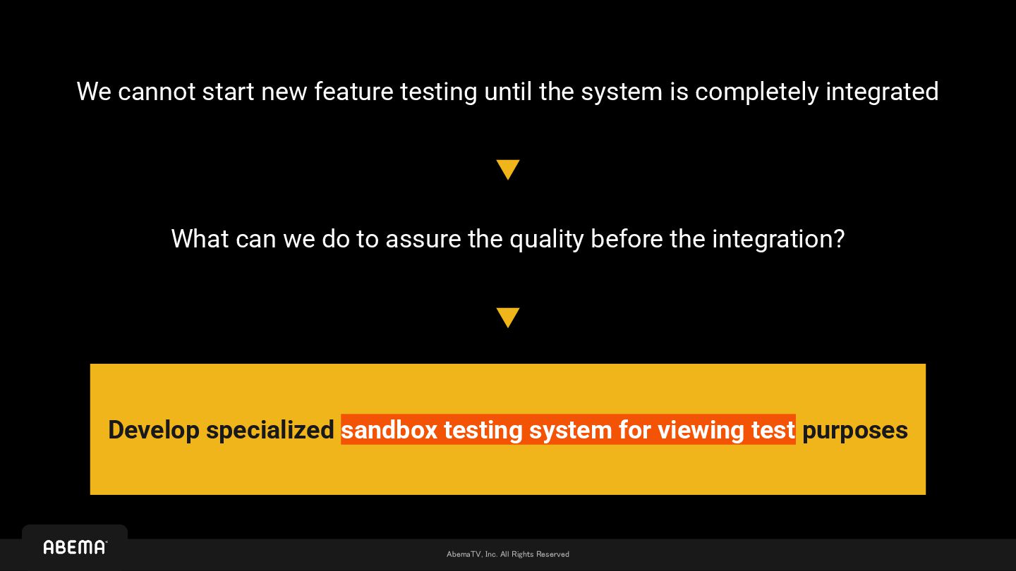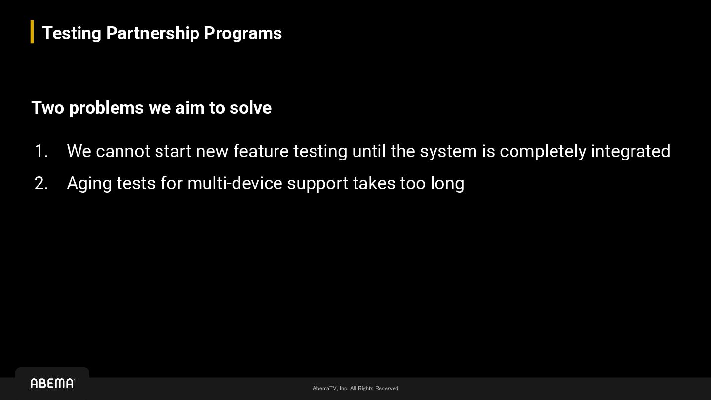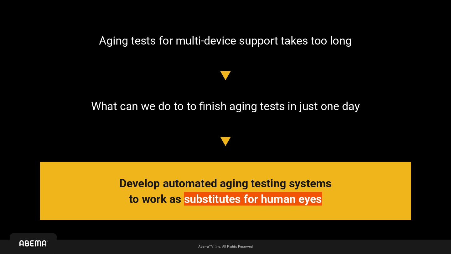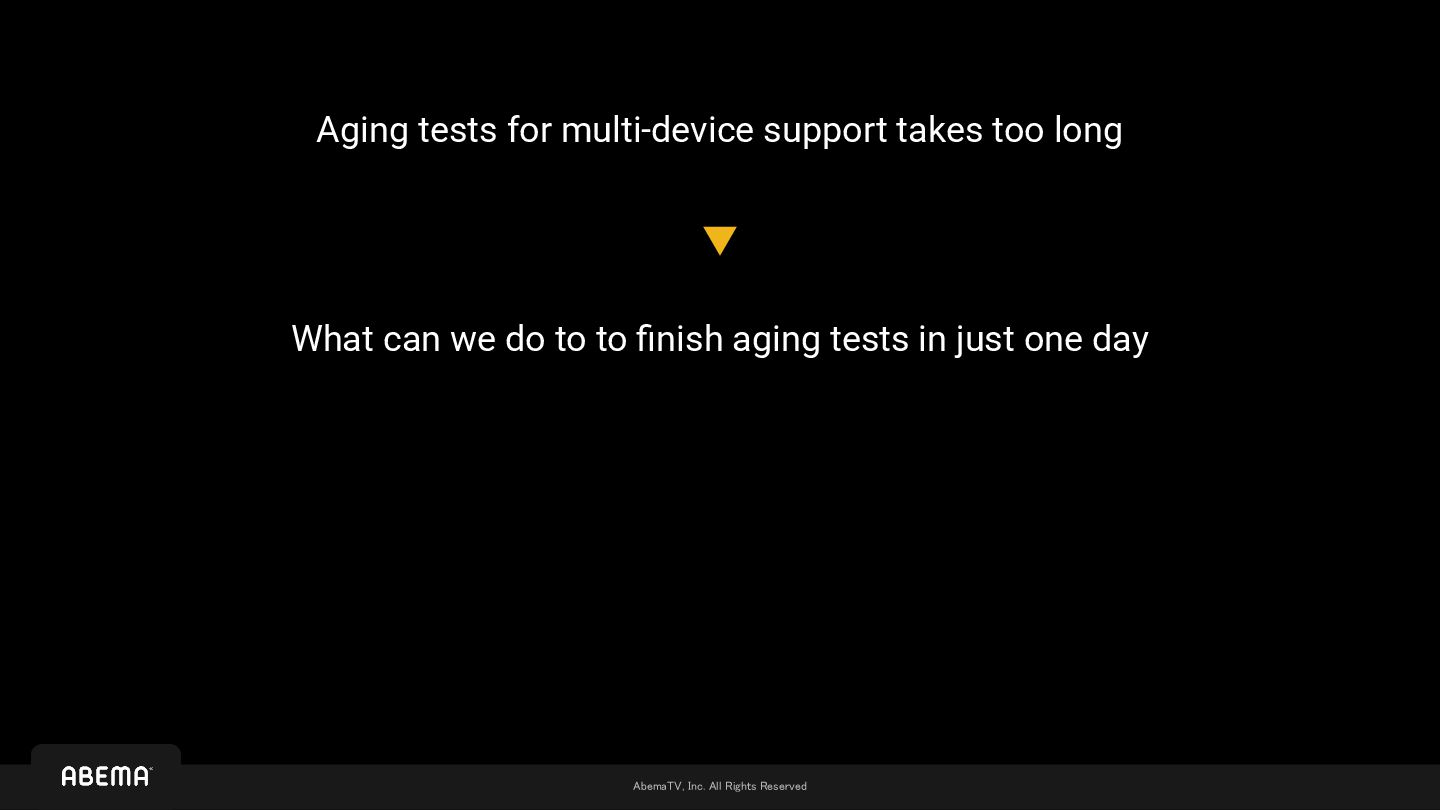 • The content of partner streams remains unknown until the systems are fully integrated ◦ Of course, general specifications are clear, but the actual output can only be determined after actual encoding ◦ Plus, even if we can receive feeds in advance, there is no mechanism to actually test the viewing experience until the integration • ABEMA maintains 22 reference devices as testbeds, with validation based on whether these devices pass at least 2-hour aging tests ◦ 2 hours * 22 devices * 3 viewing modes = 132 hours are required to perform aging tests ◦ At that time, aging testing was performed manually by human observation We managed to complete aging testing and necessary fixes within the limited timeframe to launch with satisfactory quality… However, we still incurred additional costs a lot We can't pay such cost for every additional partner !!