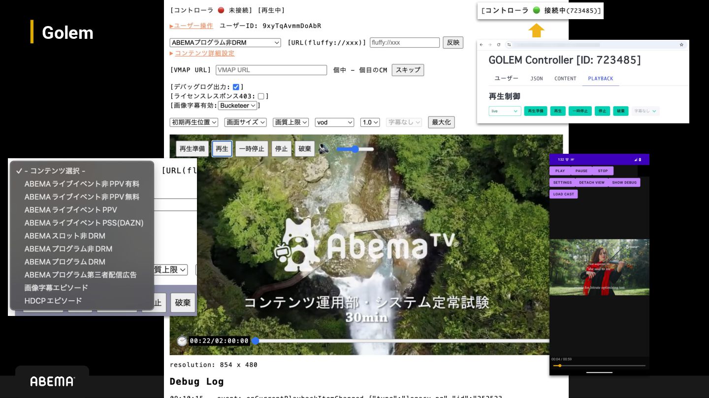testing environment Purpose • If quality assurance can be completed in Golem, all video functions should operate flawlessly • Enable testing of actual viewing experiences even when the systems are not fully integrated yet Main features • Can run any staging videos with arbitrary configurations • Can enable configuration of advertising insertion, including arbitrary VMAP and VAST settings • Can simplify difficult-to-use UI elements (such as keyboard operations via remote control)