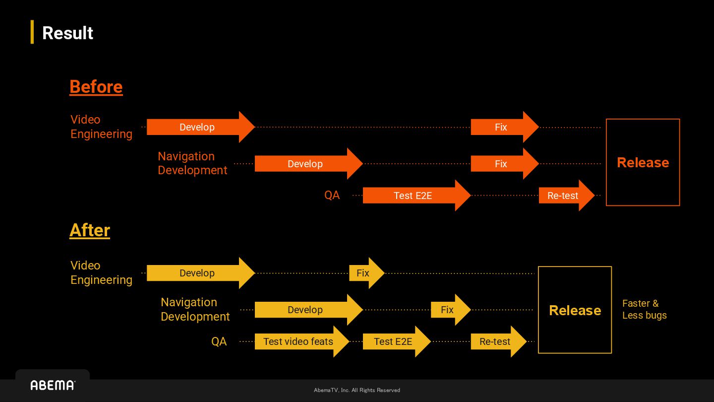 Navigation Development QA Develop Fix Develop Fix Test E2E Re-test Video Engineering Navigation Development QA Develop Develop Fix Test video feats Re-test Fix Test E2E Release Release Faster & Less bugs